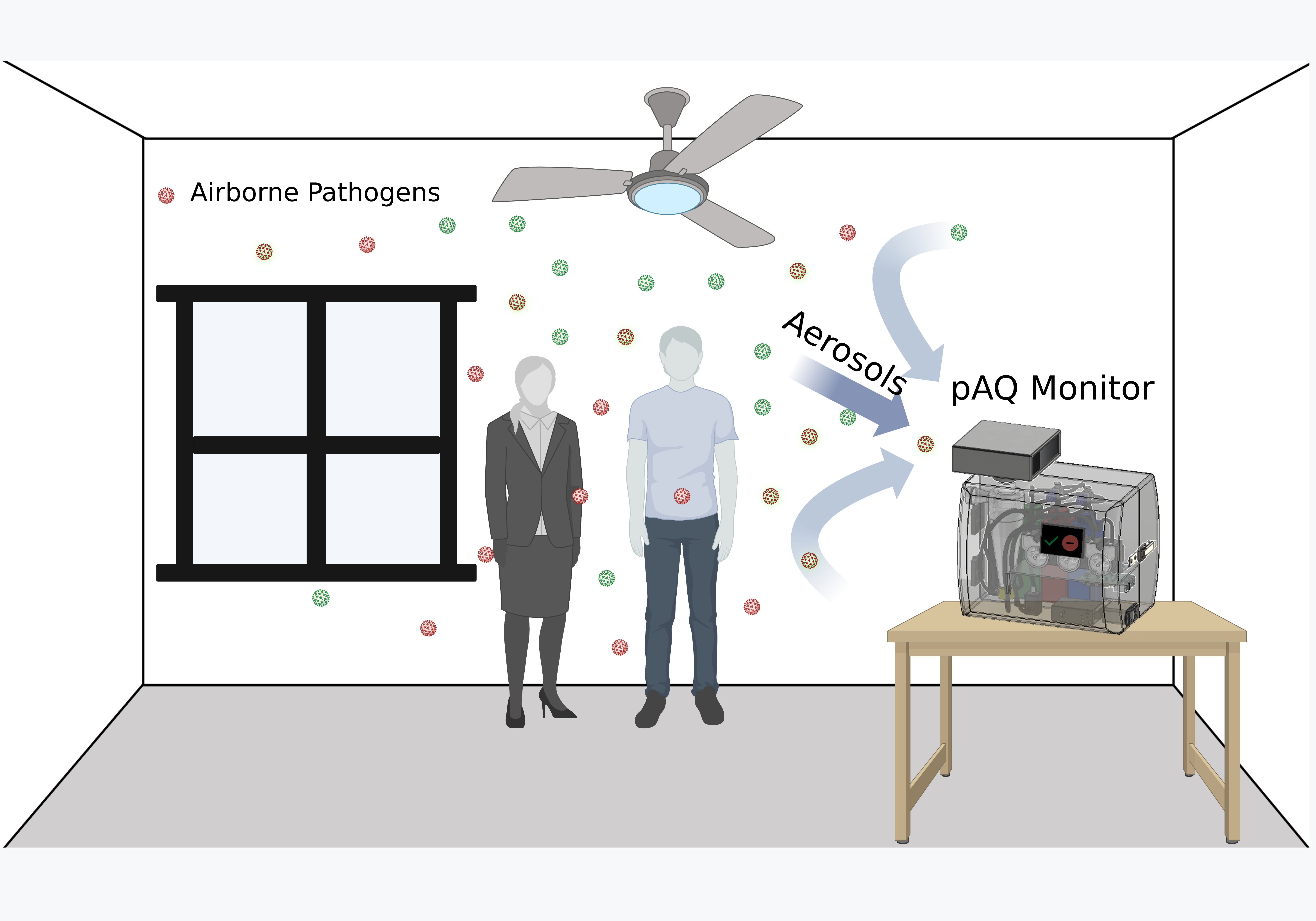 Figure 1. Airborne virus monitoring: Graphical illustration of the proof-of-concept pAQ monitor placed inside an indoor built environment to detect airborne pathogens.
