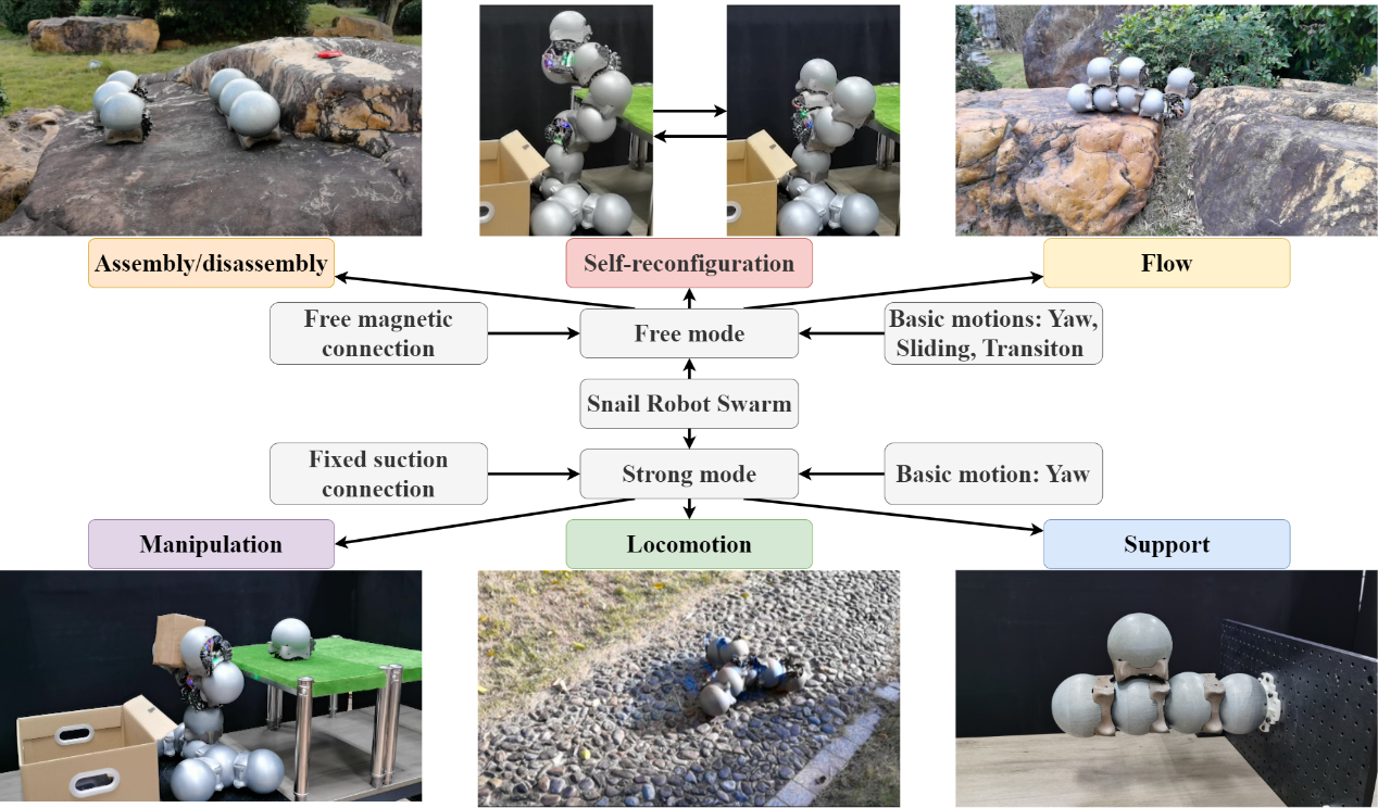 To effectively manage the diverse functionalities of a terrestrial robot swarm, we have identified six primary task categories: assembly/disassembly, self-reconfiguration, flow, manipulation, locomotion, and support, as shown in Fig 2. These tasks vary in their demands for mobility and connection strength, prompting the development of two distinct operational modes for our snail-inspired robots: free mode and strong mode. In free mode, the robots leverage differential tracks with embedded magnets to facilitate a free magnetic connection. This mode is capable of executing three primary actions—yaw, sliding, and transitioning between modules—making it suitable for tasks that require high adaptability and moderate connection strength, such as assembly/disassembly, self-reconfiguration, and flow. The magnetic connections allow for agile and smooth movements across the surfaces of other robots, enhancing the swarm's adaptability in dynamic environments. Strong mode, on the other hand, is utilized for tasks that demand higher structural stability and stronger connections. Here, the robots deploy a retractable vacuum suction cup, enhancing both vertical anti-torque and yaw drive torque. This mode is essential for supporting more demanding tasks like manipulation, locomotion, and support, where multiple robots might need to link together or form extended, cantilevered structures.