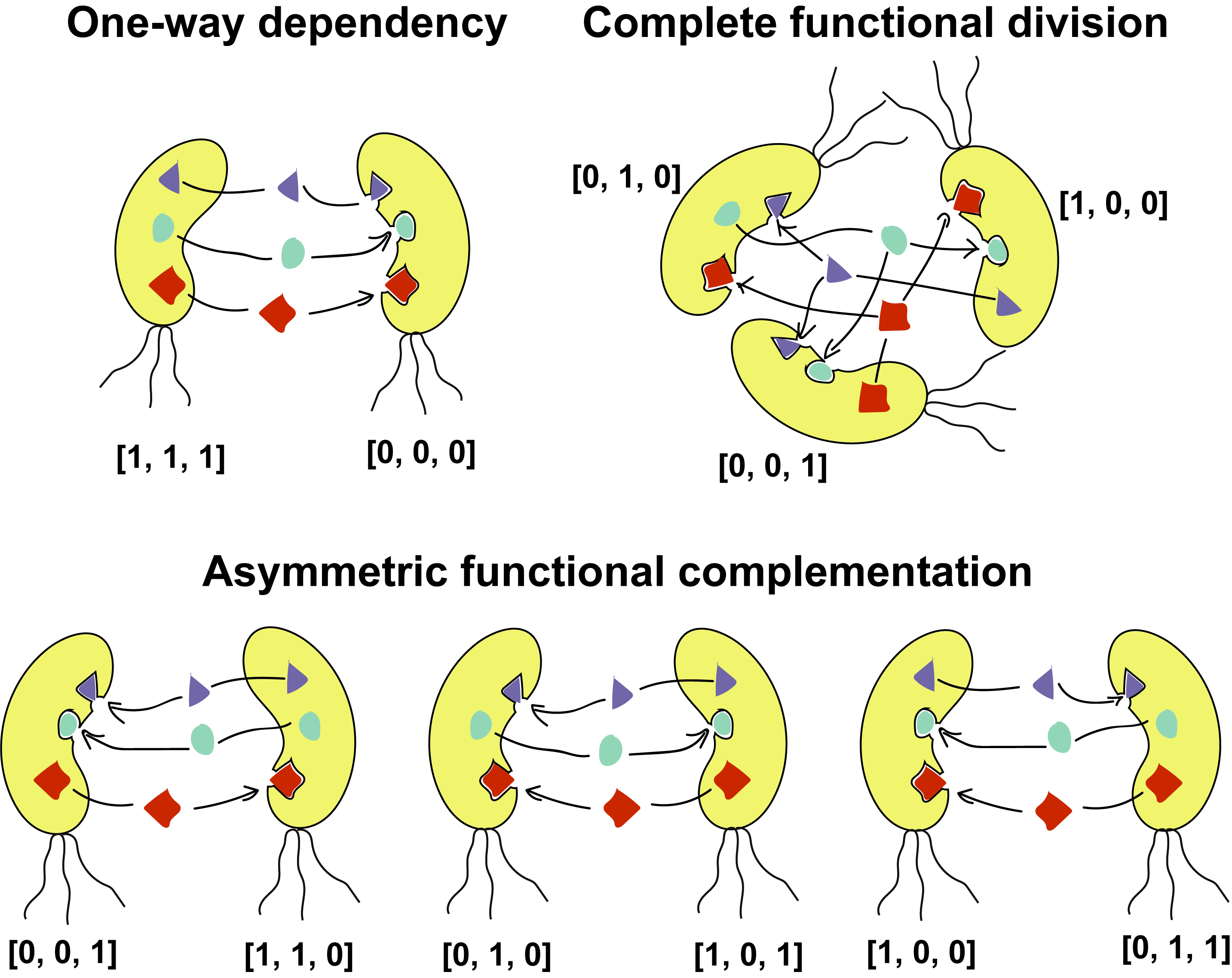Figure 2 Seven auxotrophic genotypes can emerge from reductive evolution starting with an autonomous genotype that performs three essential public functions. We use bit strings containing 1 and 0 to describe these genotypes, which indicate whether the genotype could produce the corresponding public good or not, respectively. Totally, eight genotypes is present, including the initial autonomous producer [1, 1, 1], three one-function loss genotypes (OFLGs, i.e. [1, 1, 0], [1, 0, 1], and [0, 1, 1]), three two-function loss genotypes (TFLGs, i.e. [1, 0, 0], [0, 1, 0], and [0, 0, 1]), and a non-producing cheater [0, 0, 0].