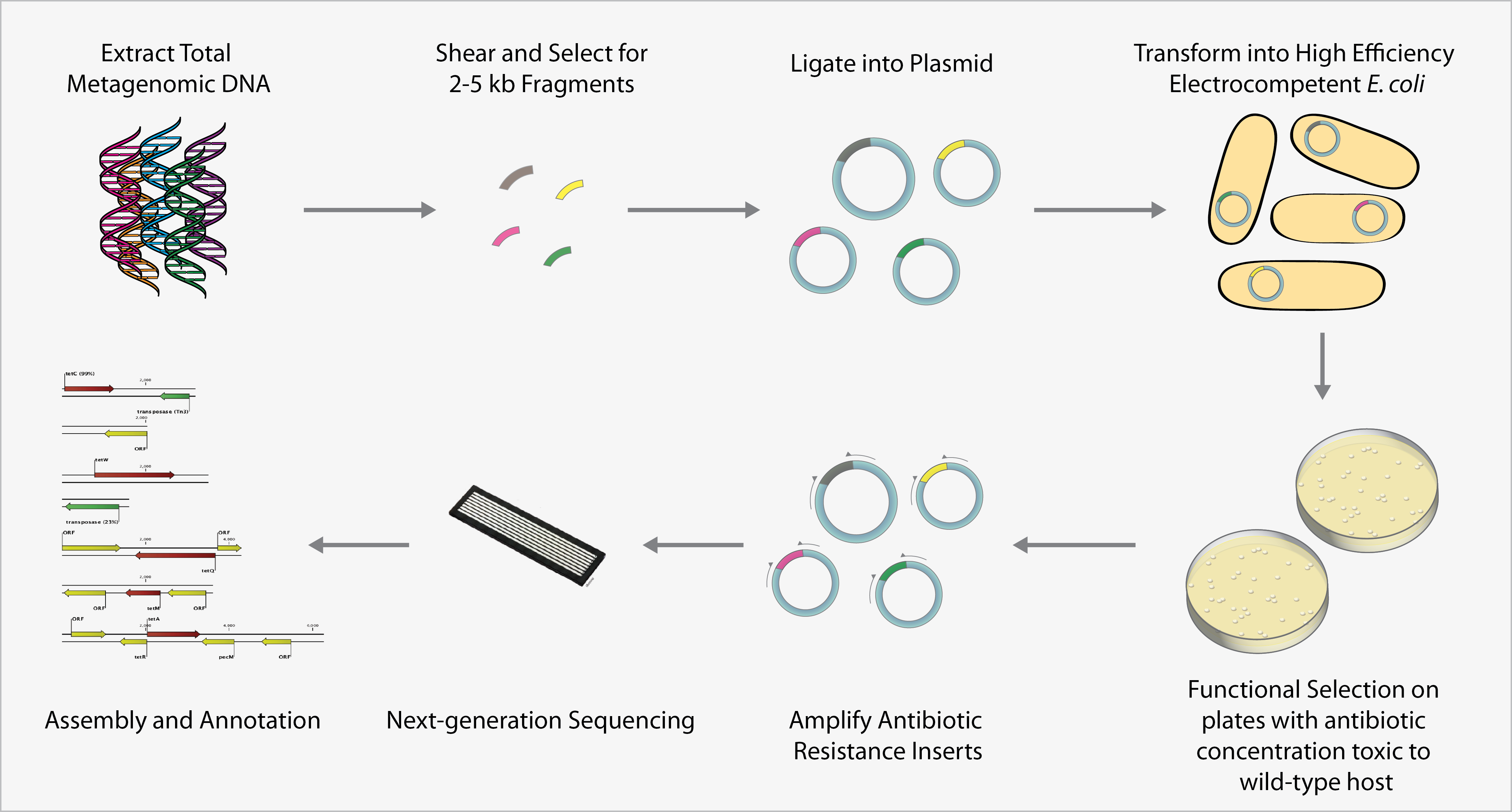 Overview of functional metagenomic selections. Total metagenomic DNA is extracted from a microbial community sample, sheared, and ligated into an expression vector and is subsequently transformed into a suitable library host to create a metagenomic library. The library is then plated on media containing antibiotics inhibitory to the wild-type host to select for metagenomic fragments conferring antibiotic resistance. Metagenomic fragments present in colonies growing on antibiotic selection media are then PCR-amplified and sequenced using either traditional Sanger sequencing or next-generation sequencing methods. Finally, reads are assembled and annotated in order to identify the causative antibiotic resistance genes.