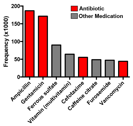 The frequency of medications administered in the NICU. Four out of the top eight medications are antibiotics. Data adapted from Clark et al., 2006 (Pediatrics).