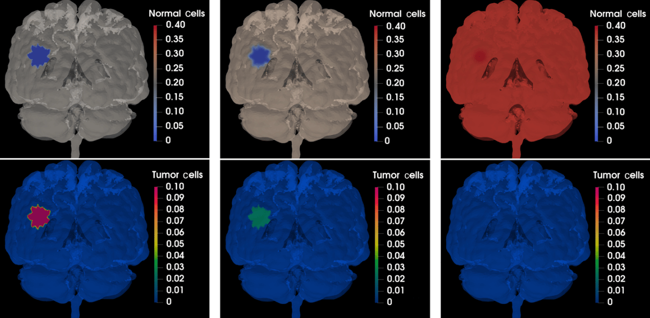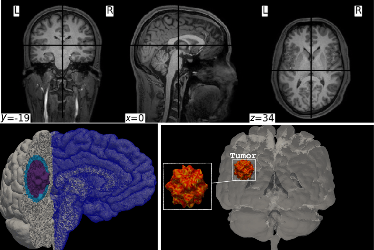 Upper panel: sample of the MRI images used to create the mesh for the cerebrum, the cerebellum, and the brainstem. Lower panel: illustration of the mesh and tumor structure. The total number of hexahedral elements is ≈ 3.289 9 × 106, and the number of DOFs is ≈ 18.949 6 × 106