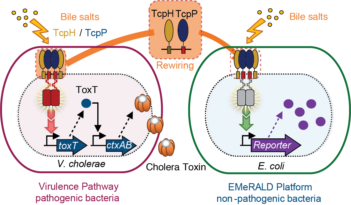 The utilization of EMeRALD platform for rewiring the bile salt sensing modules from enteropathogenic bacteria enables us to directly engineer and repurpose them in the surrogate host E.coli with the support of synthetic biology and protein engineering toolboxes. First we built the synthetic receptors by rewiring the bile salt sensing modules TcpP/TcpH and VtrA/VtrC from V.cholerae and V.parahaemolyticus into EMeRALD platform, respectively. The EMeRALD platform enables us to characterize their bilt salt specificity profiles with fluorescent signals rather than the toxin expression level. The sensor sensitivity is improved through protein engineering and directed evolution, and a functional key residue within the C-terminal loop of TcpP was further identified through next generation sequencing and sequence-function relationship analysis.