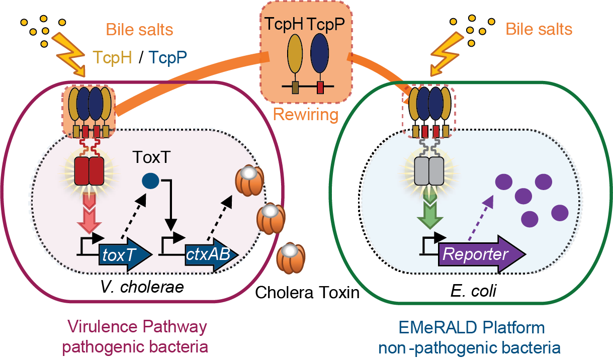 The utilization of EMeRALD platform for rewiring the bile salt sensing modules from enteropathogenic bacteria enables us to directly engineer and repurpose them in the surrogate host E.coli with the support of synthetic biology and protein engineering toolboxes. First we built the synthetic receptors by rewiring the bile salt sensing modules TcpP/TcpH and VtrA/VtrC from V.cholerae and V.parahaemolyticus into EMeRALD platform, respectively. The EMeRALD platform enables us to characterize their bilt salt specificity profiles with fluorescent signals rather than the toxin expression level. The sensor sensitivity is improved through protein engineering and directed evolution, and a functional key residue within the C-terminal loop of TcpP was further identified through next generation sequencing and sequence-function relationship analysis.