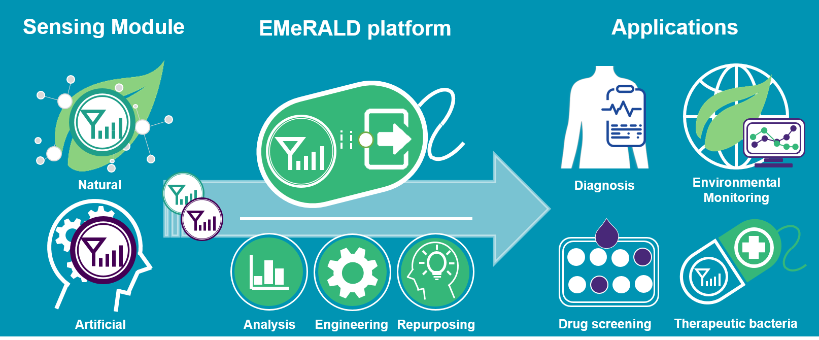 The works described above have demonstrated the potential of EMeRALD platform for studying, engineering and repurposing natural or artificial sensing modules. In addition, we have also engineered EMeRALD based bacterial biosensors which are able to detect environmental pollutants such as copper and nitrate. We can expect that the EMeRALD platform is able to accelerate the R & D process of bacterial biosensors for diverse applications such as medical diagnosis, environmental monitoring, or controlling devices for therapeutic bacteria. In addition, the capability of providing high throughput screening procedure in a biosafety environment enables EMeRALD platform for screening nature or chemical substances libraries for inhibiting pathological biosensing pathways.