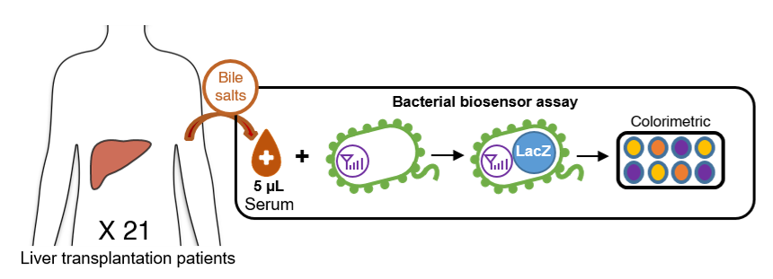 Last but not least, we tested our bactosensor in clinical serum samples from 21 liver transplantation patients. Encouragingly, It takes only 5 μL of serum sample for each test, and we have strong visible colorimetric changes detectable by the naked eyes from the samples of the patients who had a high potential of acute cellular rejection (ACR) after liver transplantation (serum bile acid > 37 μM). And the cost of the consumable materials for tests with three replicates is even less than 1 euros. This bacterial bile salt biosensor with low cost and one-pot experimental procedure encourages us to further promote large scale analysis of clinical samples in the future. It can help us to gain further understanding and to overcome the potential factors which might influence the performance of bacterial biosensors in clinical samples. I sincerely hope that this work will promote the development of robust and cost-effective liver diagnosis devices in the near future.