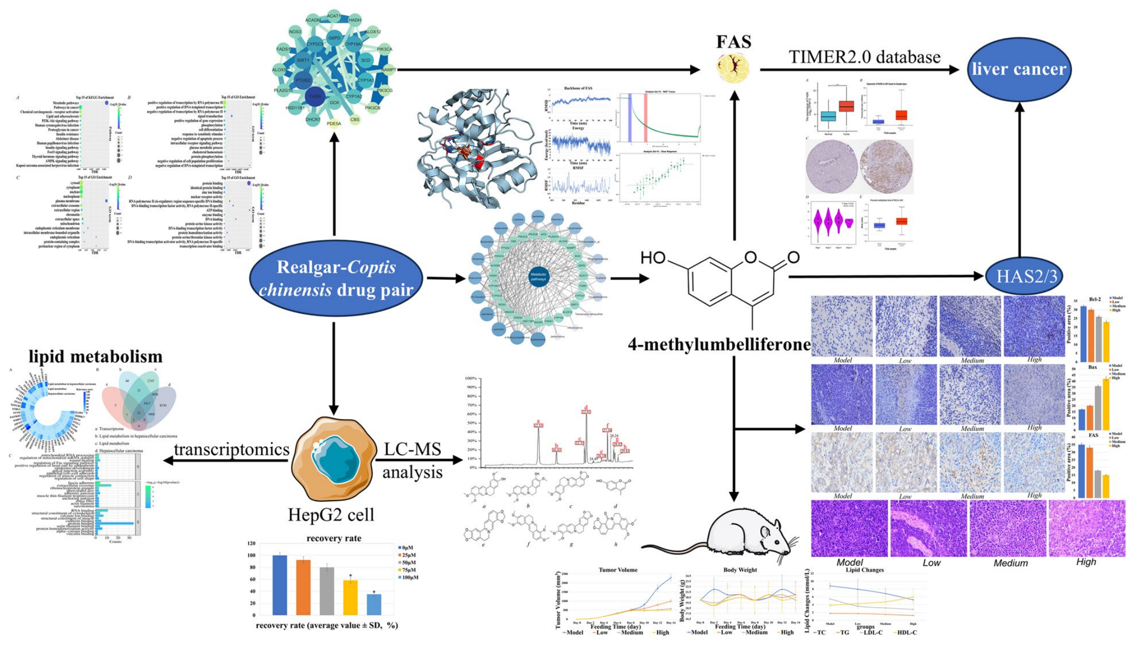 Highlight: This study identifies 4-Methylumbelliferone (4-MU) as the key active compound in the Realgar-Coptis chinensis drug pair against hepatocellular carcinoma. 4-MU inhibits tumor growth by targeting fatty acid synthase (FAS) to induce apoptosis and suppressing HAS2/3 to disrupt the tumor microenvironment, as validated by in vivo experiments.