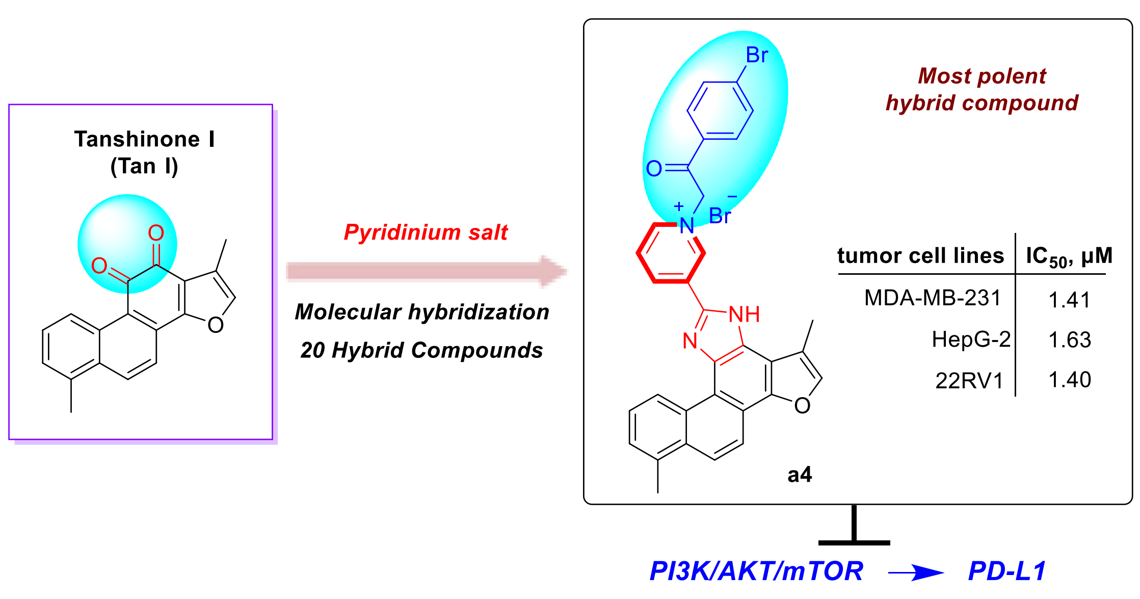 Highlight: Twenty novel tanshinone I-pyridinium salt derivatives were synthesized to overcome the weak potency and poor drug-like properties of natural tanshinone I. Compound a4 exhibited the strongest cytotoxicity against multiple cancer cell lines (IC50: 1.40–1.63 μM). Mechanistically, a4 acts as a PI3Kα inhibitor, suppressing the PI3K/Akt/mTOR pathway and downregulating PD-L1 expression, highlighting its potential as an anticancer agent.