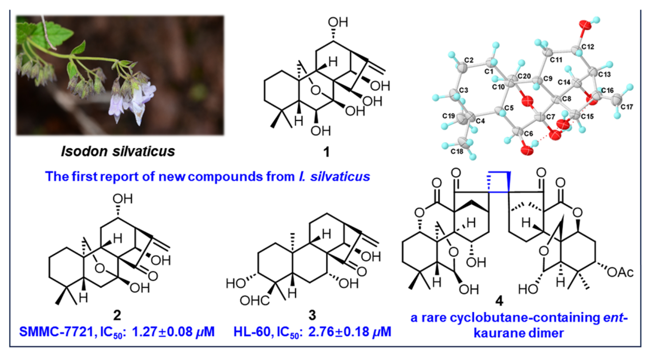 Highlight: Three new ent-kaurane diterpenoids and a novel dimer were isolated from Isodon silvaticus. Compounds 2 and 3 were found to exhibit remarkable, broad-spectrum cytotoxic effects against five human tumor cell lines (HL-60, A-549, SMMC-7721, MDA-MB-231, and SW-480).