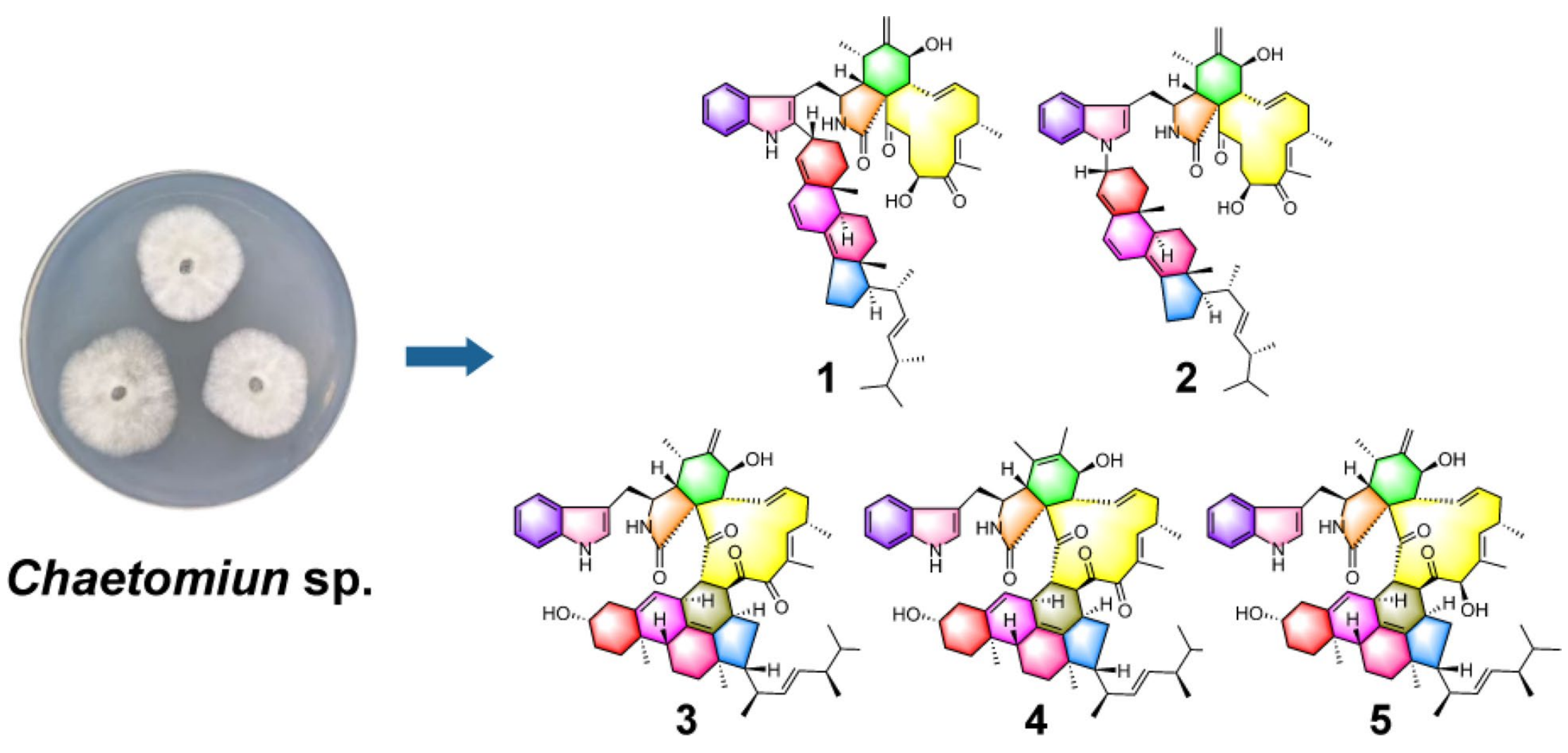 Highlight: Five new heterodimers (chalasoergodimers A–E) were isolated from marine Chaetomium sp., featuring novel dimerization modes. Chaetoglobosin monomers (9–12) showed cytotoxic activity against A549 lung cancer cells, with compound 12 being the most potent (IC50 = 5.14 μM).