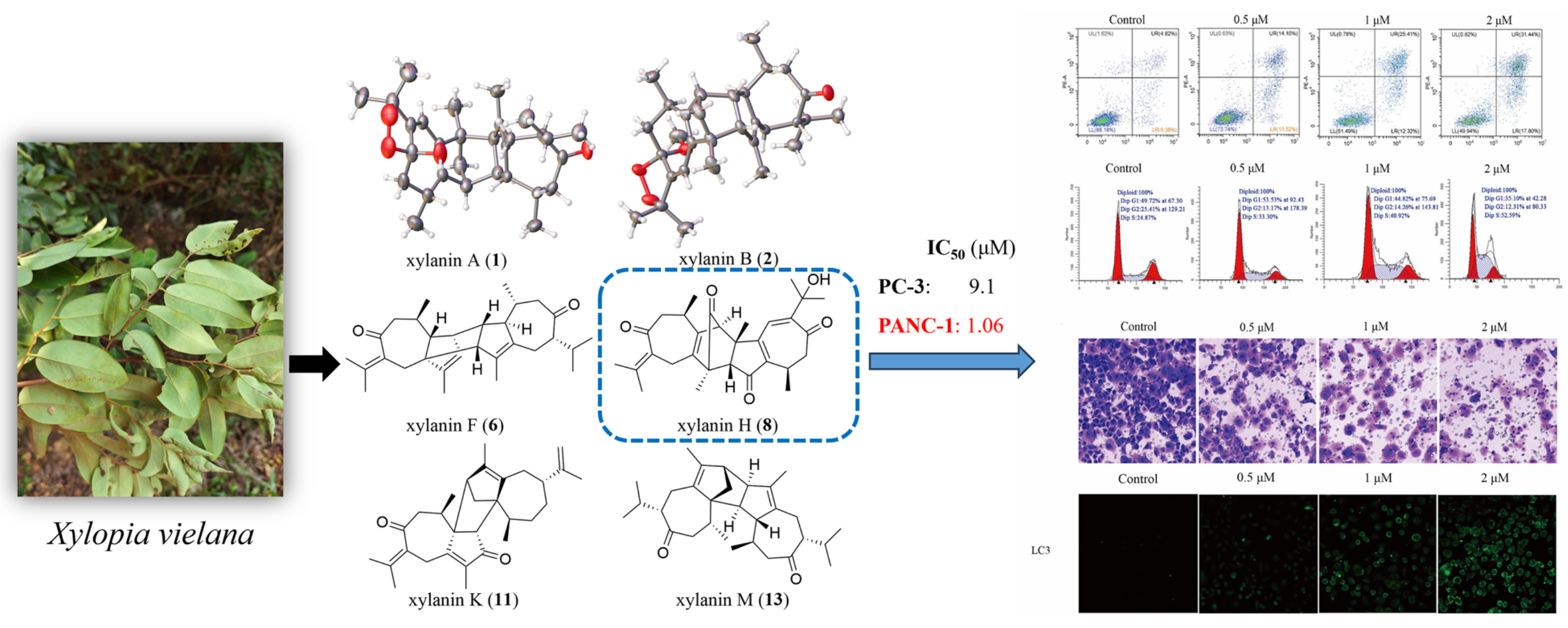 Highlight: Sixteen novel guaiane-type sesquiterpene dimers (xylanins A–P) and six known analogues were isolated from Xylopia vielana. Their structures were elucidated using spectroscopic methods and X-ray crystallography. Compound 8 showed the most potent cytotoxicity against PANC-1 pancreatic cancer cells (IC50 = 1.06 μM). Mechanistic studies revealed that compound 8 induces apoptosis, causes S-phase cell cycle arrest, inhibits cell invasion, and promotes autophagy in PANC-1 cells.