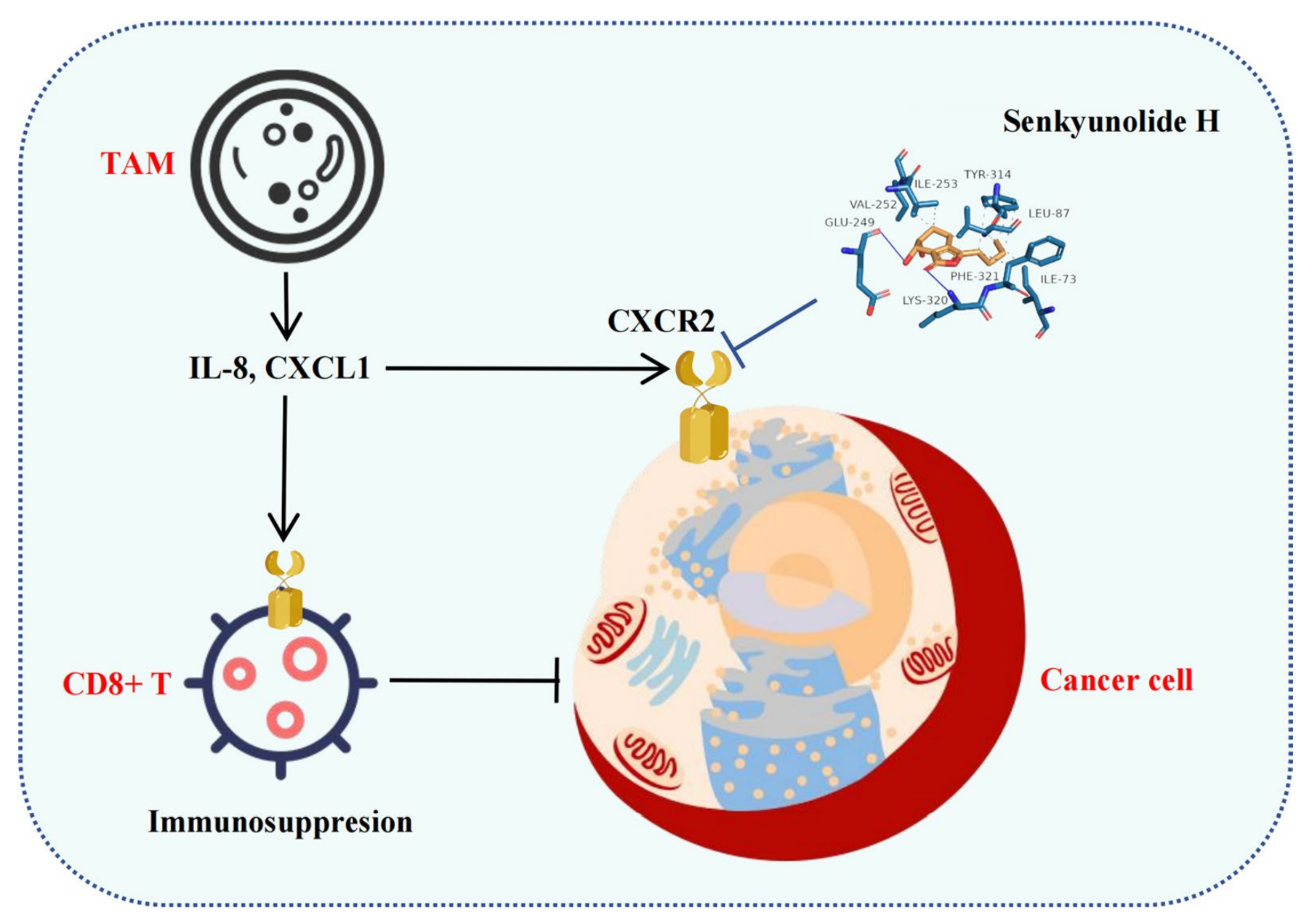 Highlight: This study identifies IL-8 as a key mediator in depression-associated breast cancer progression. Through transcriptomic analysis and Mendelian randomization, IL-8 was found to promote tumor growth via its receptor CXCR2. The compound senkyunolide H was shown to inhibit this pathway by regulating CXCR2, effectively counteracting the pro-tumor effects of depression in both in vitro and in vivo models.