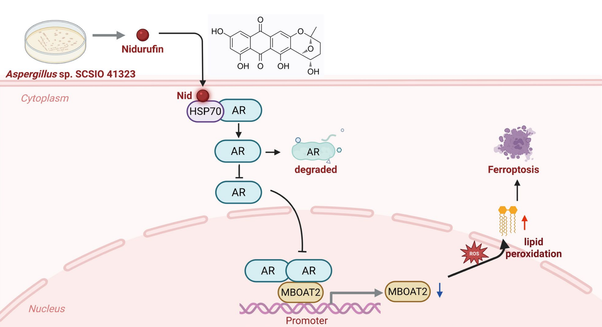 Highlight: This study identifies Nidurufin (Nid) as a novel HSP70-targeting compound that induces ferroptosis in AR-positive prostate cancer cells. Nid directly binds HSP70, disrupting its chaperone function and leading to AR protein destabilization. This subsequently downregulates the AR-target gene MBOAT2, a key ferroptosis suppressor, thereby triggering ferroptotic cell death. The findings validate the HSP70-AR-MBOAT2 axis and position HSP70 as a promising therapeutic target to overcome AR dependency in prostate cancer.