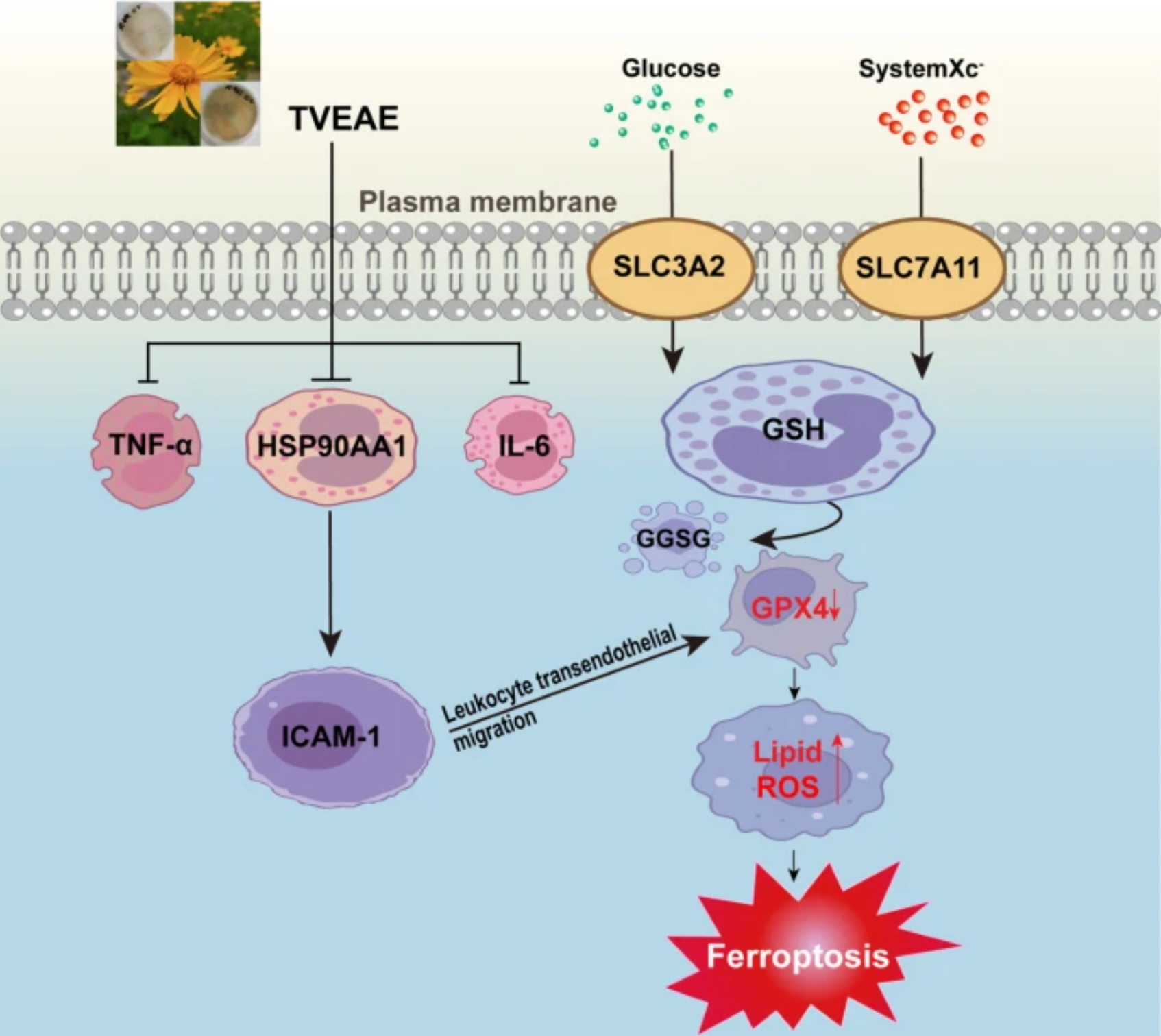 Highlight: Trichoderma viride ethyl acetate extract (TVEAE) exhibits significant anti-Triple-Negative Breast Cancer (TNBC) efficacy validated in both in vitro and in vivo models. Mechanistically, it triggers ferroptosis—a regulated cell death pathway—by selectively modulating the leukocyte transendothelial migration (TEM) signaling axis. Integrated multi-omics analysis identified IL-6, TNF-α, and HSP90AA1 as core therapeutic targets. Chemical profiling via GNPS revealed six anti-TNBC metabolites, including Gliotoxin and erucamide.