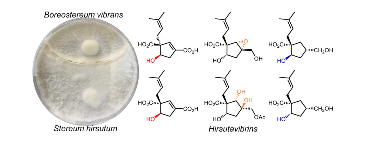 Highlight: Employing a co-cultivation strategy of the two congeneric fungi, Stereum hirsutum and Boreostereum vibrans, this research led to the isolation of eleven new vibralactone derivatives. Hirsutavibrins A (1) and B (2) showed weak cytotoxicity against the human lung cancer cell line A549, opens a new avenue for fungal co-culturing study between congeneric fungi.