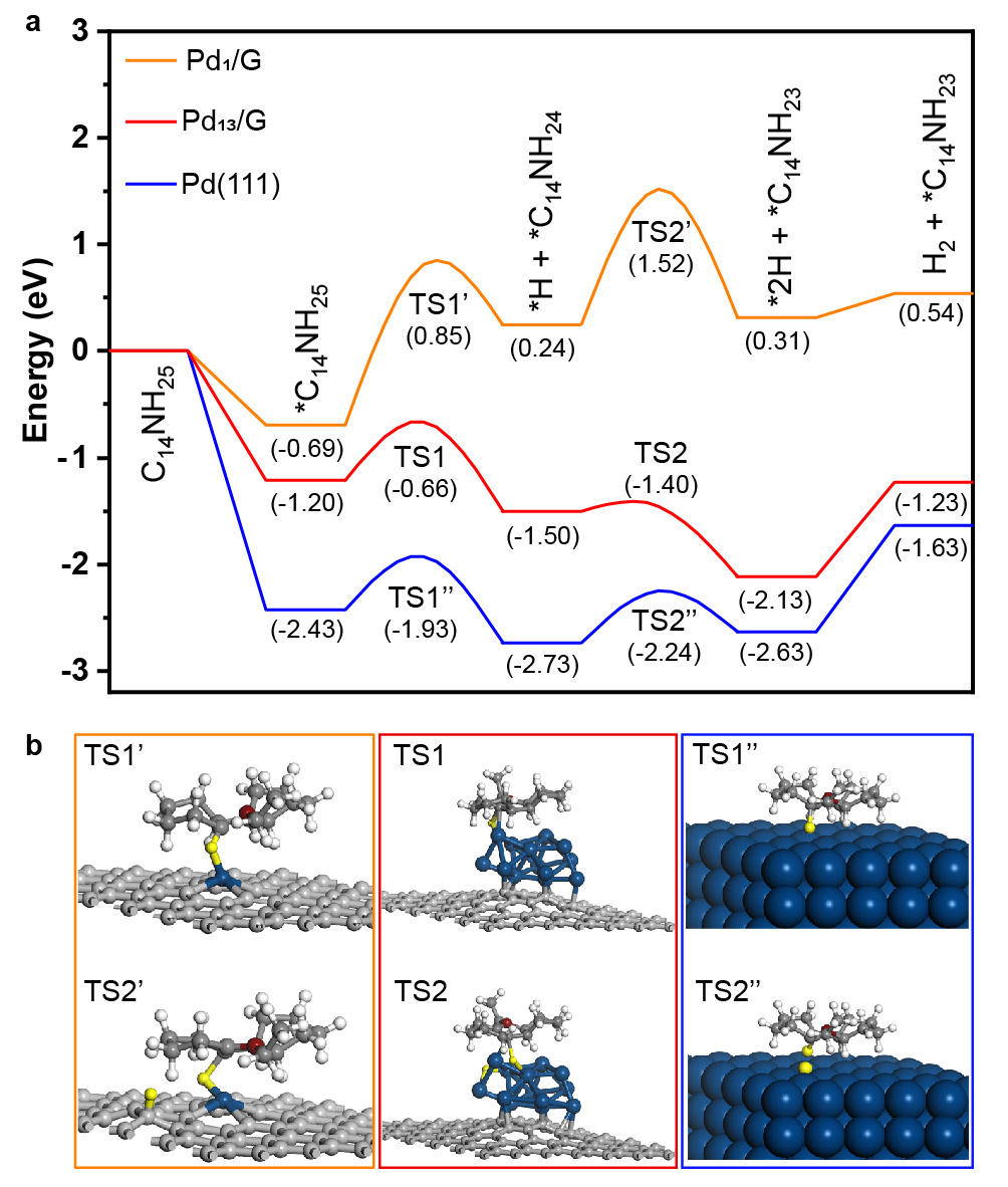 Figure 4. DFT calculations of the Pd-catalyzed DNEC dehydrogenation process. (a) Reaction path and energy profiles in the initial stage dehydrogenation of DNEC on Pd1/G, Pd13/G and Pd(111) respectively. (b) Corresponding transition state (TS) configurations. Pd, H (activated), H (non-activated), C and N atoms are shown in blue, yellow, white, grey, and wine-red color, respectively.