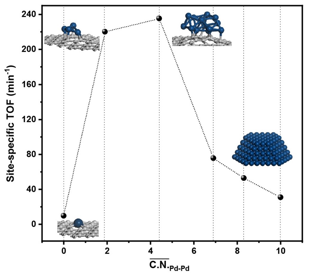 Counting the numbers of Pd1 and Pd ensemble sites on catalyst through electron microscope may lead to huge statistical errors due to limited sampling times. In comparison, by utilizing CO-probe infrared spectroscopic analysis with both site-sensitivity and statistical significance, we are able to distinguish Pd1 from Pd ensemble sites macroscopically and further calculate the proportions of different sites on catalysts (Figure 2g). Eventually, after subtracting the structural and catalytic contributions of Pd1 sites from different ensemble catalysts, an accurate structure-performance correlation, i.e., the correlation between the C.N.Pd-Pd of Pd species and the site-specific turnover frequencies in DNEC dehydrogenation reactions was established (Figure 3). Significantly, the fully-exposed Pd cluster with C.N.Pd-Pd of 4.4 manifested the highest TOF of 235.2 min-1, which is 24 and 7 times higher than that of the Pd1 and large Pd particles, making it the optimal site among the whole scale regime.