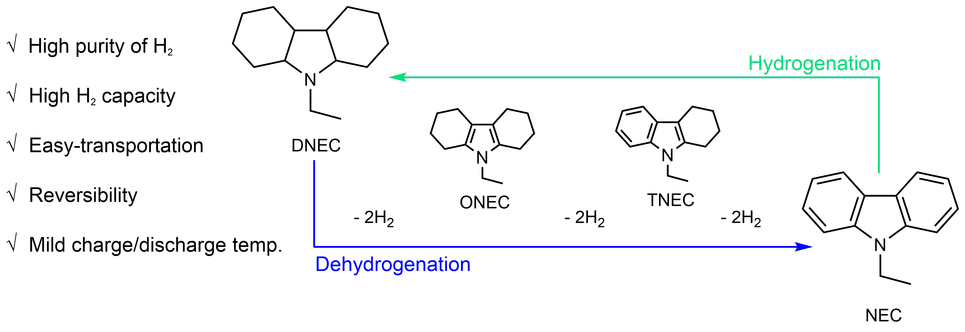 Figure 1. Illustrations of the physicochemical advantages and reversible hydrogenation and dehydrogenation process of the NEC/DNEC system for hydrogen storage and utilization.