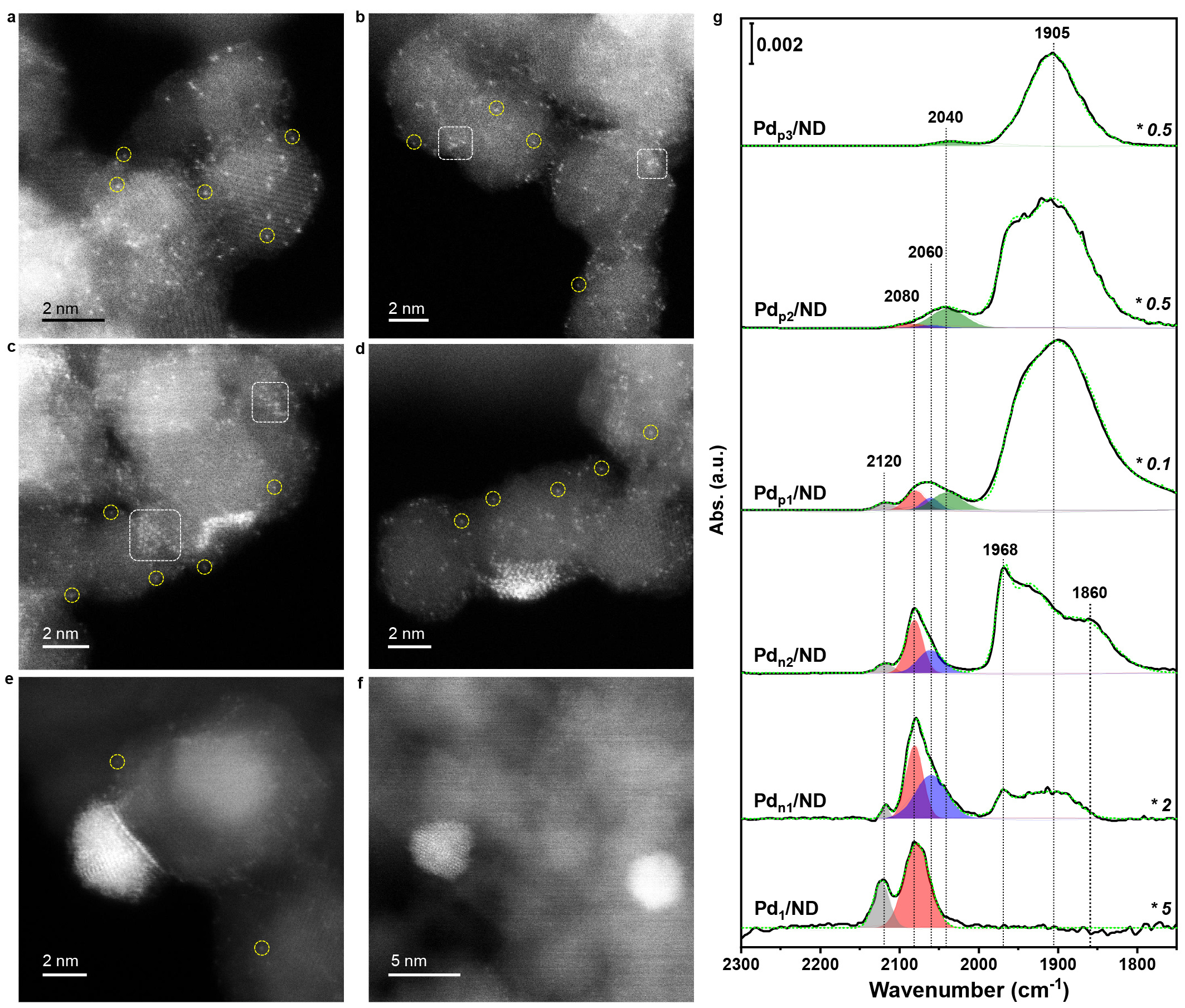 Figure 2. Structures of different Pd/ND catalysts. Atomic-resolved HAADF-STEM images of (a) Pd1/ND, (b) Pdn1/ND, (c) Pdn2/ND, (d) Pdp1/ND, (e) Pdp2/ND and (f) Pdp3/ND. The yellow circles and white rectangles highlight Pd1 and Pdn, respectively. (g) CO-probe DRIFT spectra of different Pd/ND catalysts.