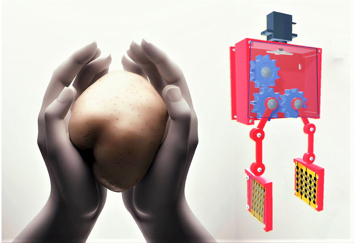(L) Human cognitive adaptability for gripping irregular objects (R) COGBOT with graphene-printed CAPSENSAR attached to the pair of end arm tools
