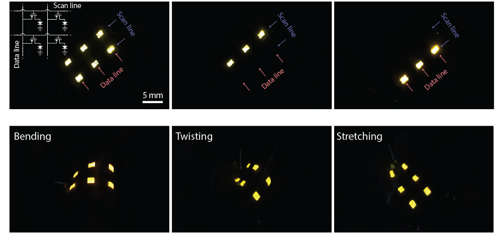 The most important finding in our work is show the possibility to realize the world’s first intrinsically stretchable active-matrix driven light-emitting array composed of intrinsically stretchable materials and fabricated by all solution-processing techniques. We expect the future work of higher density or multi-color display, or with further integration of other fully stretchable sensor arrays to provide human-interactive systems for sensing on-body information display and detection through visual interaction. For more details, please see our recent work published in Nature Communications: