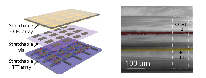 Our work is enabled by three new developments: an intrinsically stretchable organic light-emitting electrochemical cell (OLEC), an intrinsically stretchable organic thin-film transistor (TFT)-driven active-matrix, and the integration between these two components. In order to achieve sufficient light emission from an OLEC device, powered by a stretchable TFT, the main challenge is to develop TFTs with matching power. Based on performance of our OLECs, the minimum current density to generate human eye-distinguishable luminescence is around 2-2.5 mA/cm2. Thus to drive a such a stretchable OLEC pixel for visualization (e.g. 2 mm x 2 mm for one pixel), the individual stretchable TFT needs to provide around 10-4 A of current at moderate voltages1; while for the reported stretchable TFT, the current were mostly <10-6 A even at high gate voltages2.