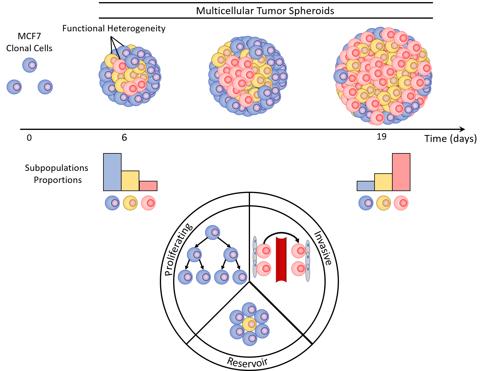 While the proportion of proliferative and invasive subpopulations proportions shifted with time, the reservoir remained constant. The reservoir subpopulation might be an essential player in generating new tumors because it is intermediate to the others. The functional identity of this last subpopulation was the most challenging aim. However, we consider that its understanding will open new avenues of research with relevant implications in designing new treatments to defeat cancer.