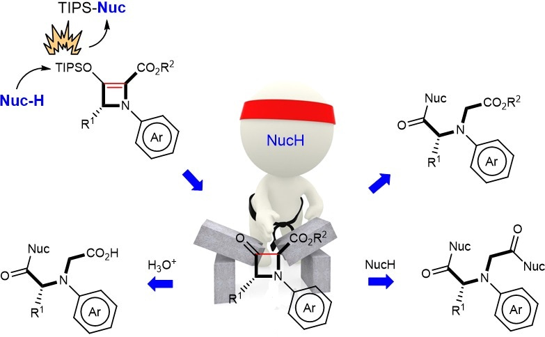 We envisioned that removal of the silyl group from the 2-azetine product would form 3-azetidinones that would be susceptible to retro-Claisen ring opening4 because of the high ring strain in the four-membered ring. However, our initial attempt to remove the silyl group using TBAF under standard conditions resulted in a facile ring opening reaction with a mixture of products, and all attempts to modify conditions to form the 3-azetidinone failed. The cleavage reaction demonstrated the innate instability of the 3-azetidinone-2-carboxylate as well as the potential for nucleophilic ring opening of the donor-acceptor azetine. We envisioned this process as a general methodology for nucleophile induced retro-Claisen reactions and, because the reactant 2-azetine could be formed with high enantioselectivity, the ring opened product would retain the same optical purity. Mechanistic studies revealed that the product was formed in near quantitative yields only if two equivalents of the nucleophile were used at room temperature - one equivalent of the nucleophile for silyl group removal and the other for nucleophilic ring opening. This retro-Claisen reaction, aided by strain release, provides a methodology for the attachment of chiral units to a variety of amines and alcohols, and tolerates a broad scope of nucleophiles, including naturally occurring amines, alcohols, amino acids, and other nitrogen-based nucleophiles (Fig. 2).