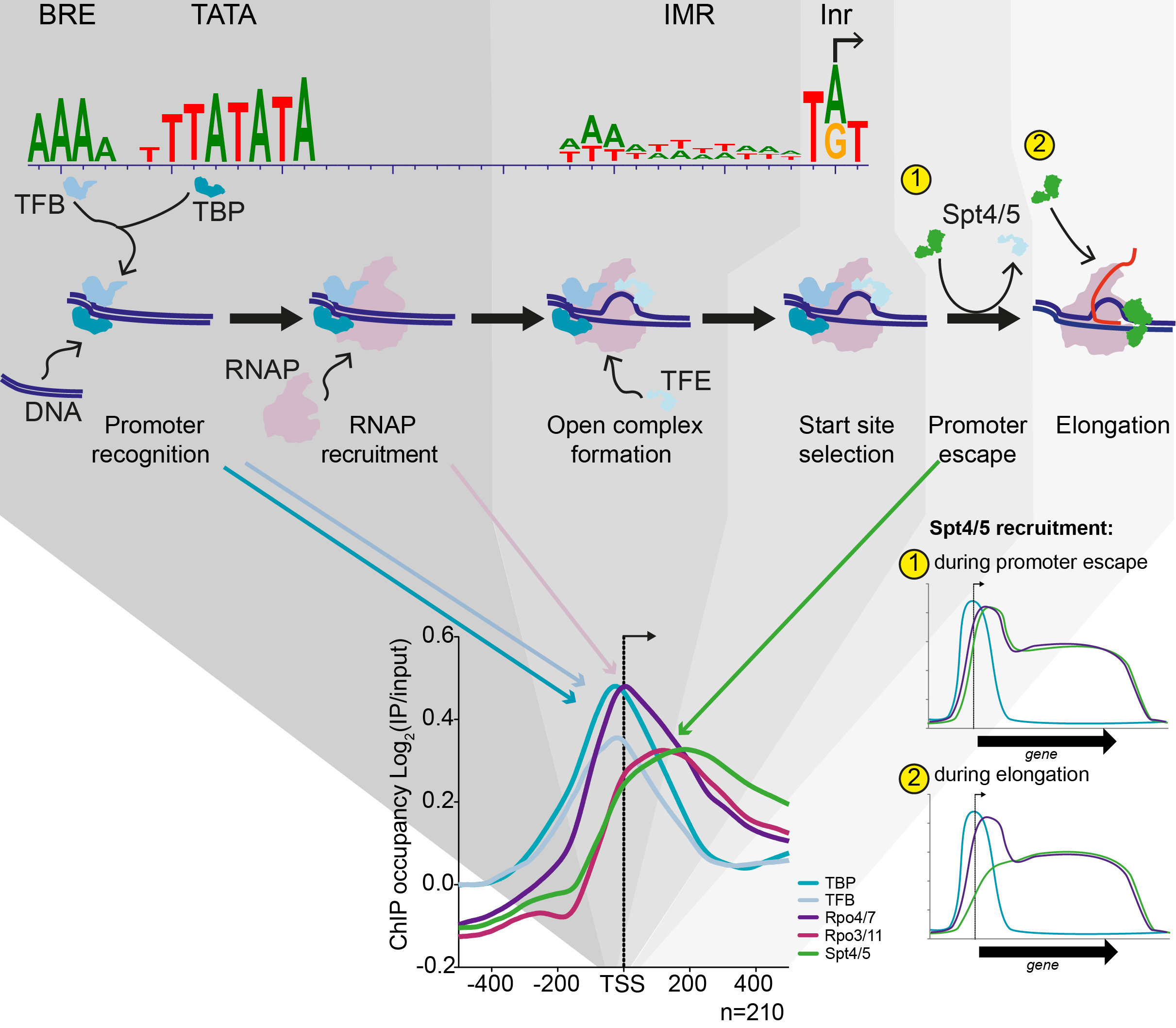 Figure 2. By using a combination of approaches, we were able to assess genome-wide the contribution of promoter sequence (based on TSS mapping) and transcription factors (based on ChIP-seq) to the different stages of the transcription cycle in the archaea. Examining the promoter features and averaging the occupancy profile around the transcription start sites reflects the initial stages of transcription from promoter recognition to elongation. Looking at the profiles at individual loci reveals two modes of recruitment of elongation factor Spt4/5.