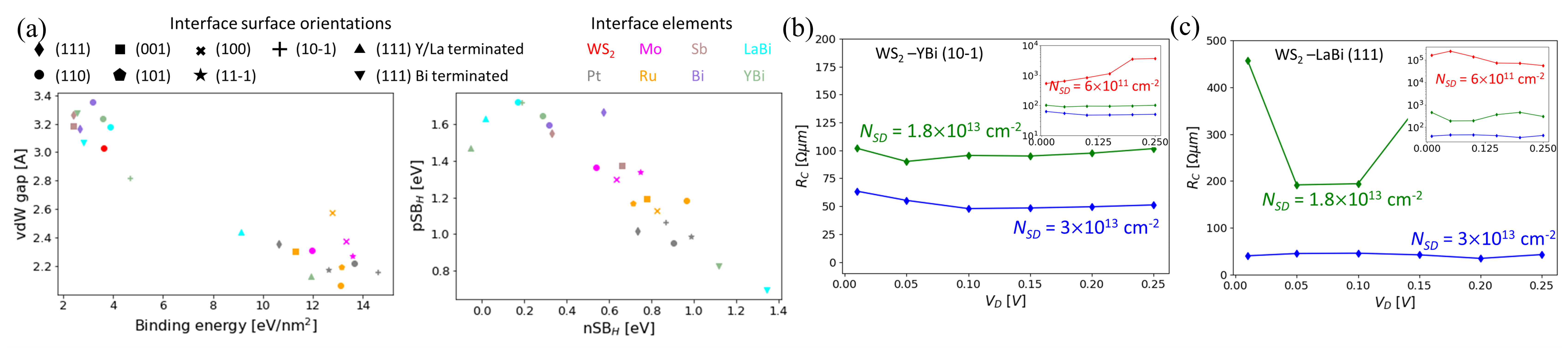 We therefore predict that the high contact resistances found in experiments are thus the result of defects, e.g., no proper contact between metal and semiconductor, or non-ideal material choices, e.g., metal-semiconductor interfaces characterized by a large Schottky barrier.