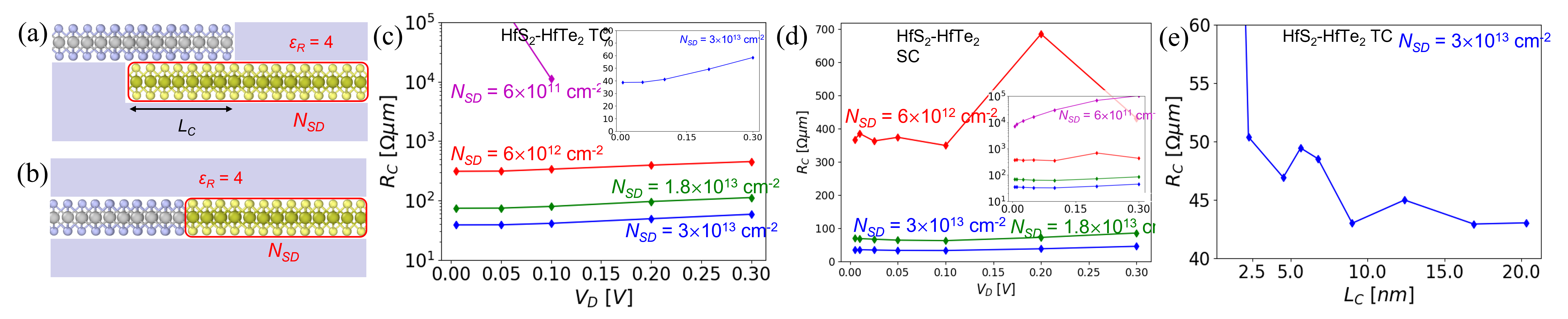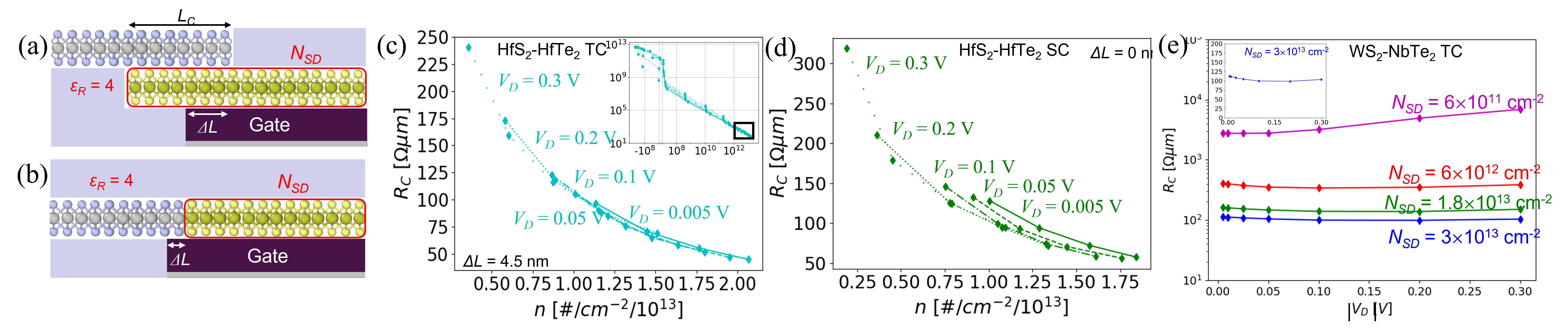 Figure 1. 2D-2D contact results with conventional doping. (a) and (b) show the structure for top and side contacts, respectively. (c) and (d) show their contact resistance values as a function of the bias and the doping concentration. (e) shows the influence of the top contact overlap length.