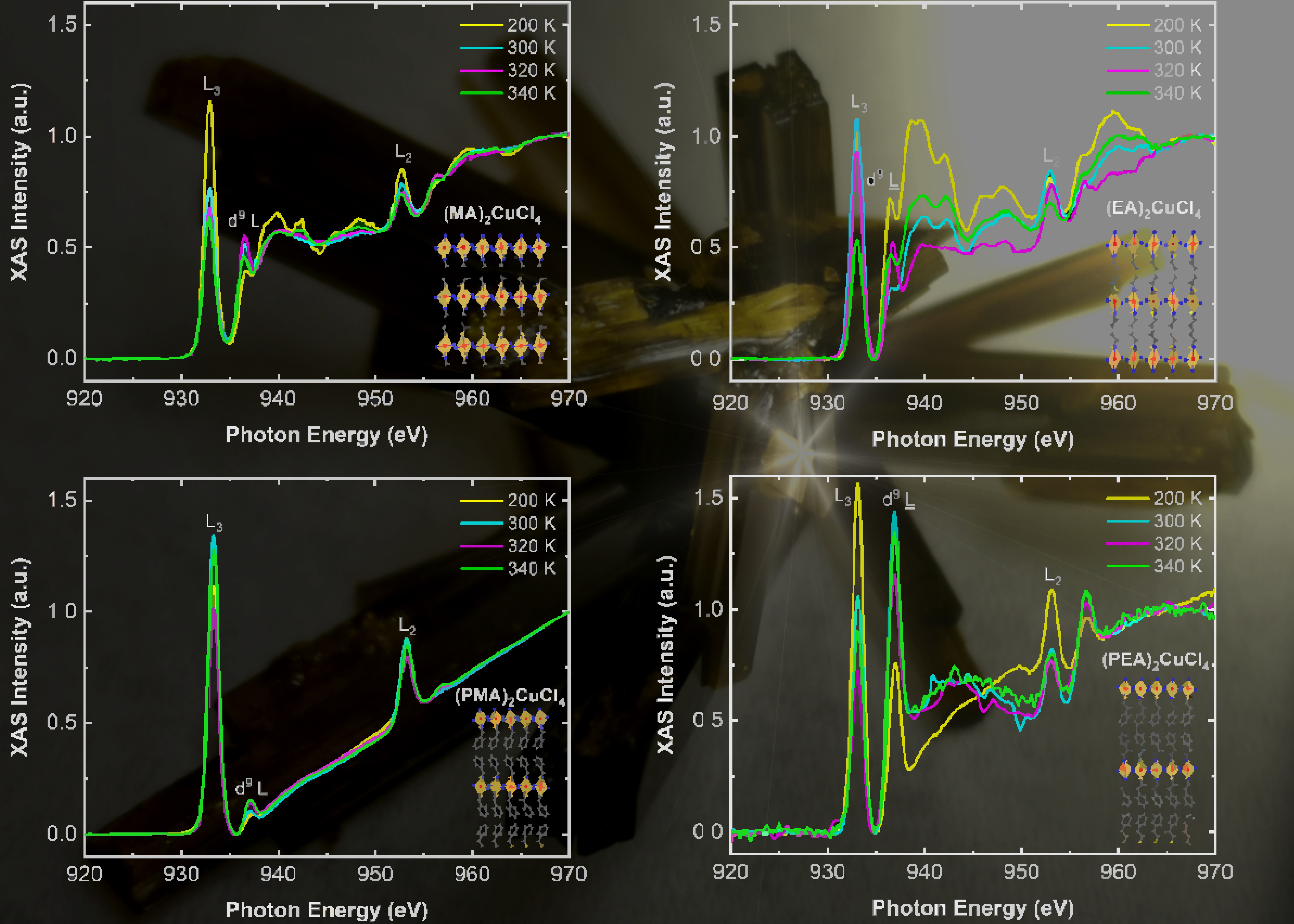 To continue our research in the direction of correlated spin systems, here, we observed the structural transition, optical signature and electronic modulation are present in the copper chloride (A2CuCl4, A = MA, EA, PMA, PEA) single crystals under variable temperature using combined photoluminescence and high-resolution synchrotron spectroscopies. The main results of X-ray absorption spectra (XAS) of all investigated copper chloride perovskite crystals are shown in Figure 1. The spectra show several copper L2,3 edge peaks which demonstrated the implication of the ligand size and the observed temperature. In addition, some crystals did show the presence of local-induced antiferromagnetic interaction between the neighbouring copper-inorganic sheets. We also performed density functional theory calculations to prove such ligand effect to the electronic properties of our copper halide perovskite crystals, especially the odd-even effects of organic spacer in this copper halide perovskite crystals. The future applications such as quantum computations are very interesting due to the tuneable and correlated spin systems that can be offered by such stable perovskite structures.