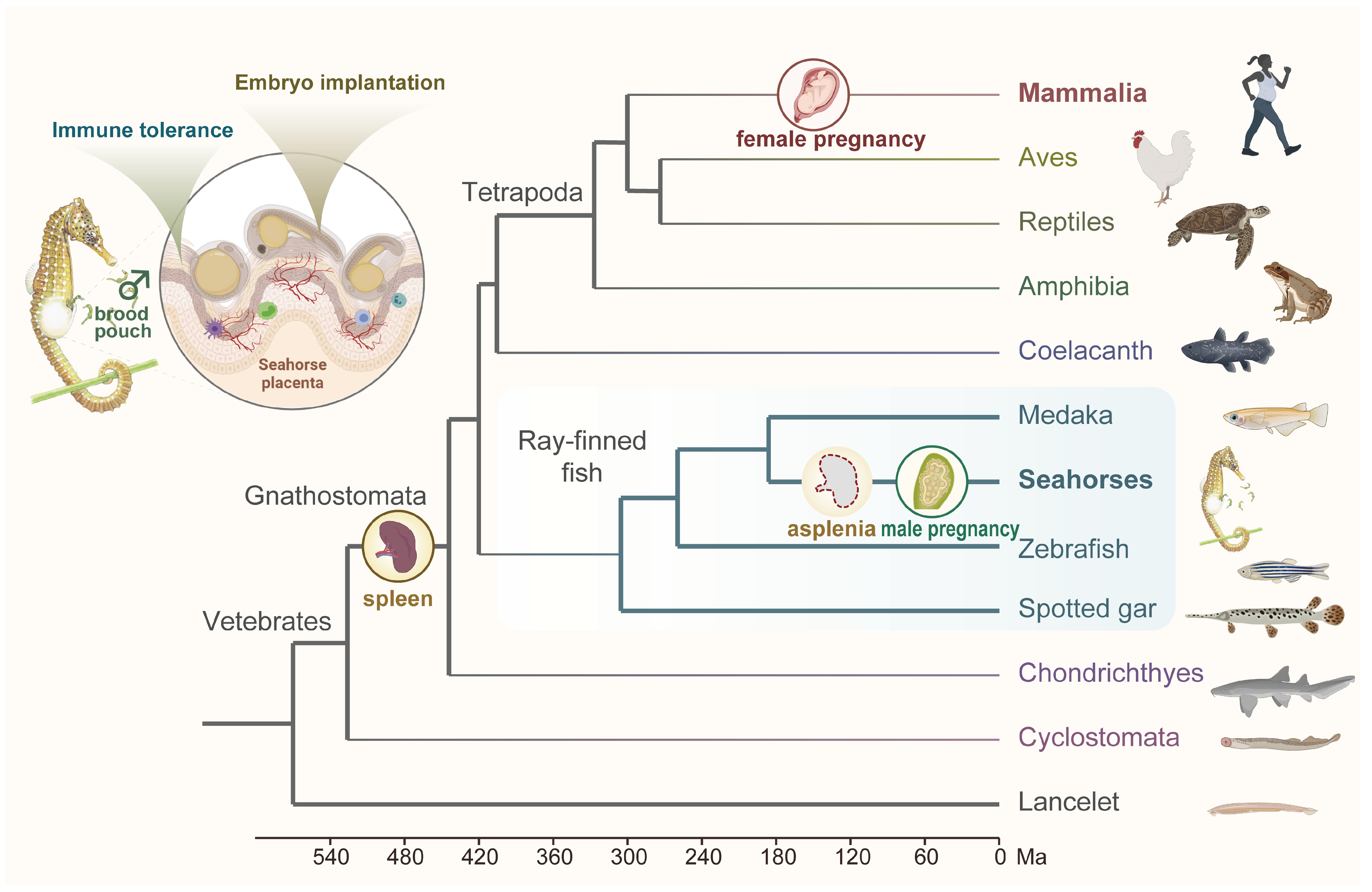 Figure 2. A species tree showing the evolution of specialized male pregnancy and asplenia traits in the seahorse.