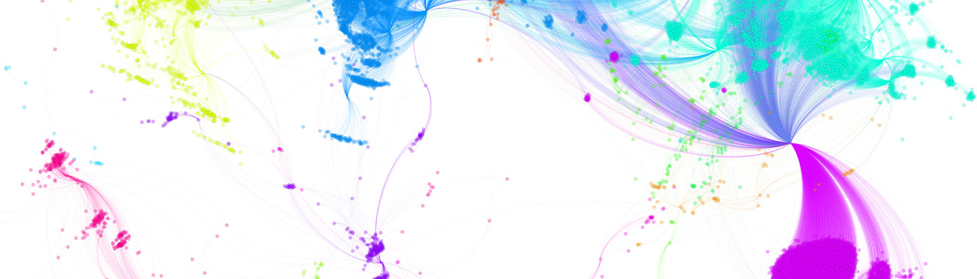 A representation of the network of species threatened by invasive species in islands. The colours of the nodes and links represent the 21 clusters that were identified as priority for conservation regarding biological invasions. Image by Celine Bellard.