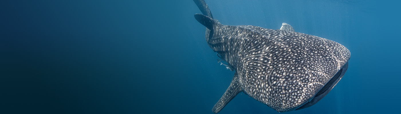 Whale shark at Al Shaheen, Arabian Gulf, offshore Qatar. During the summer months, whale sharks gather here in large aggregations. The whale sharks release environmental DNA to the ocean water, which is a source to important population genetic insights.
