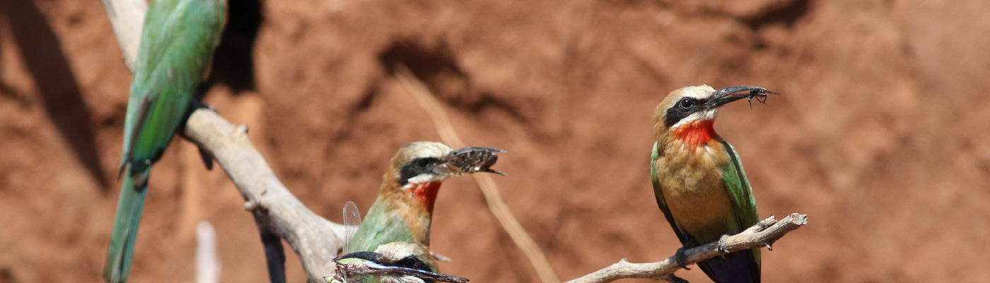 Why are animals, such as these White-fronted bee-eaters, Merops bullockoides, which live in hot and unpredictable environments more likely to breed cooperatively? Research shows that cooperative breeding in birds has enabled the invasion of ecological niches inhospitable to independent breeders. Photo by Derek Keats.