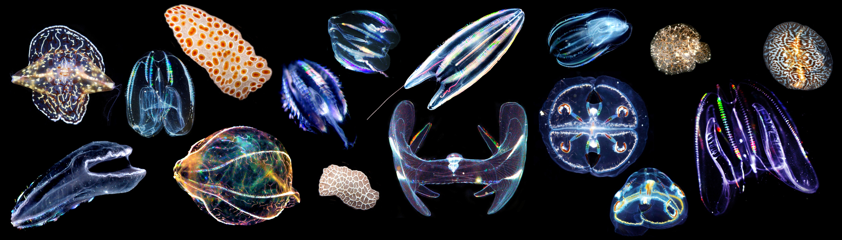 Novel sequencing and phylogenomic analyses of representative ctenophore species, collected around the world (from cold Antarctica to hot equatorial seas), provide strong evidence that they are (i) the sister group to all other animals and (ii) resolved evolutionary relationships of comb jellies to each other including molecular clock estimates of the time of the divergence among the major animal lineages. Photos by Leonid L. Moroz and Gustav Pauley. Collage by Leonid L. Moroz.