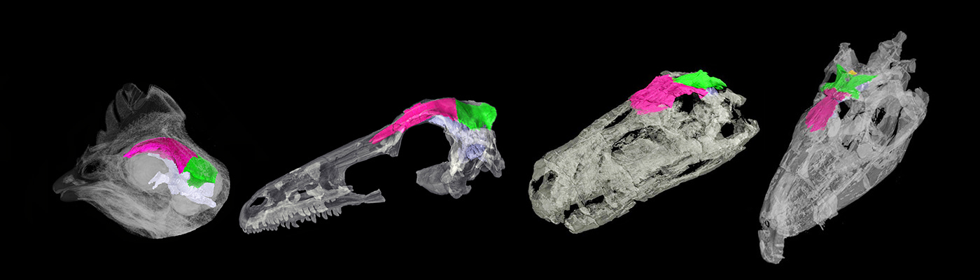 Enlargment of the brain and consequent expansion of the frontal and reduction of the parietal along the bird branch. The taxa represented are the archosauriformes Proterosuchus, the early dinosaur Herrerasaurus, the paravian Zanabazar and the extant bird Gallus. Image by Matteo Fabbri.