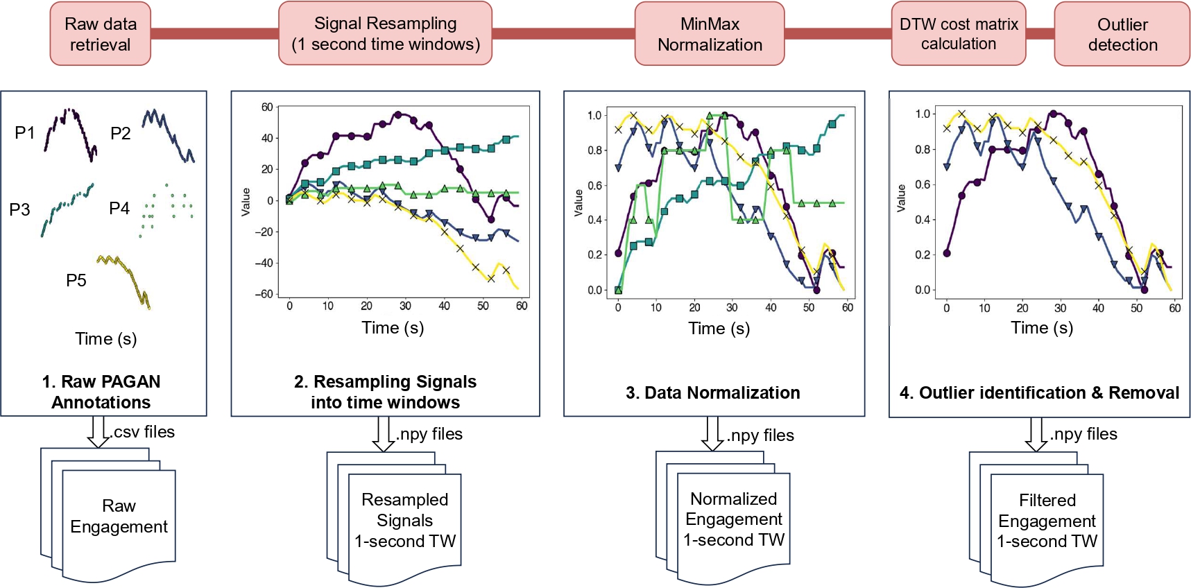 To ensure there is enough data on each video to approximate the ground truth accurately, every clip in the dataset is annotated by 5 human participants. As part of our repository, we provide scripts to process these labels and extract the ground truth signals for each clip, including methods for removing outliers based on their degree of disagreement with other participants. This flexibility allows the dataset to cater to research projects which want to model the subjectivity of the labels, as well as those which solely seek to model the consensus of participants.