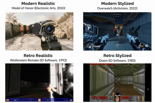 of the game (stylized versus realistic) and game era (retro vs modern).