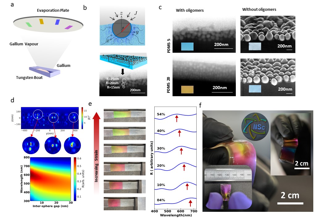 In our work, we use a bio-compatible elastomer called Polydimethylsiloxane as a substrate. It contains uncured oligomers, which we showed to be in the fluidic state. We deposit Ga, a low-melting-point metal with excellent plasmonic properties, onto PDMS substrates by single-step thermal evaporation (Fig. 1a). The capillary interactions between the oligomers and liquid Ga take over the task of determining Ga nanostructures (Fig. 1b). Since it is the oligomer content which can be experimentally controlled one can obtain multiple nanostructures and hence the structural color on a single deposition by putting in PDMS with different oligomer content into the evaporation chamber. This allows the simultaneous fabrication of multiple structural colors.