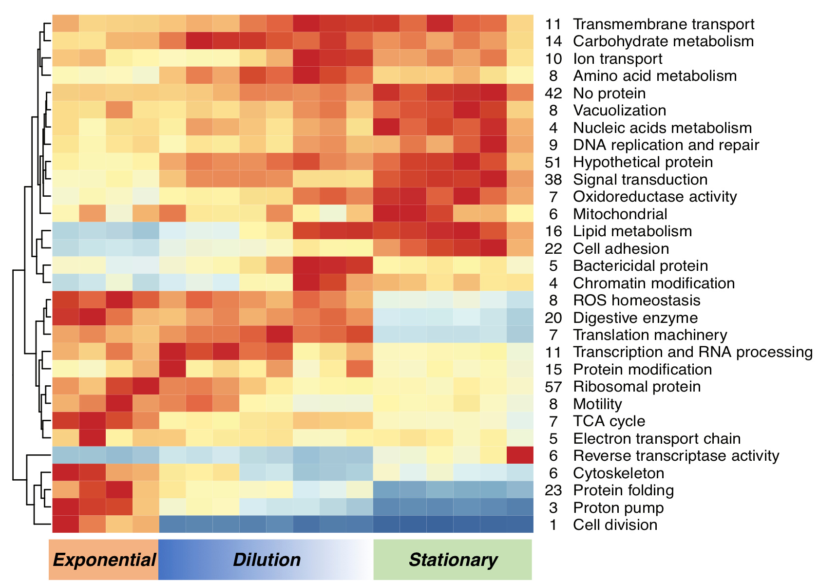 The comparison between states is relative, so these two functions may appear stronger in the stationary phase because the other functions are downregulated. In fact, the expression of these two functions is low, as shown by the green bars in Fig. 5 (they include a red cell because values are normalized within each function). Also, the genes involved (9 within DNA replication and repair and 4 within Nucleic acids metabolism) show contrasted expression patterns (6 are upregulated at the stationary and 2 at the exponential, see Fig. S5). This plot was constructed to get a general overview of the expression patterns among all the functions identified.