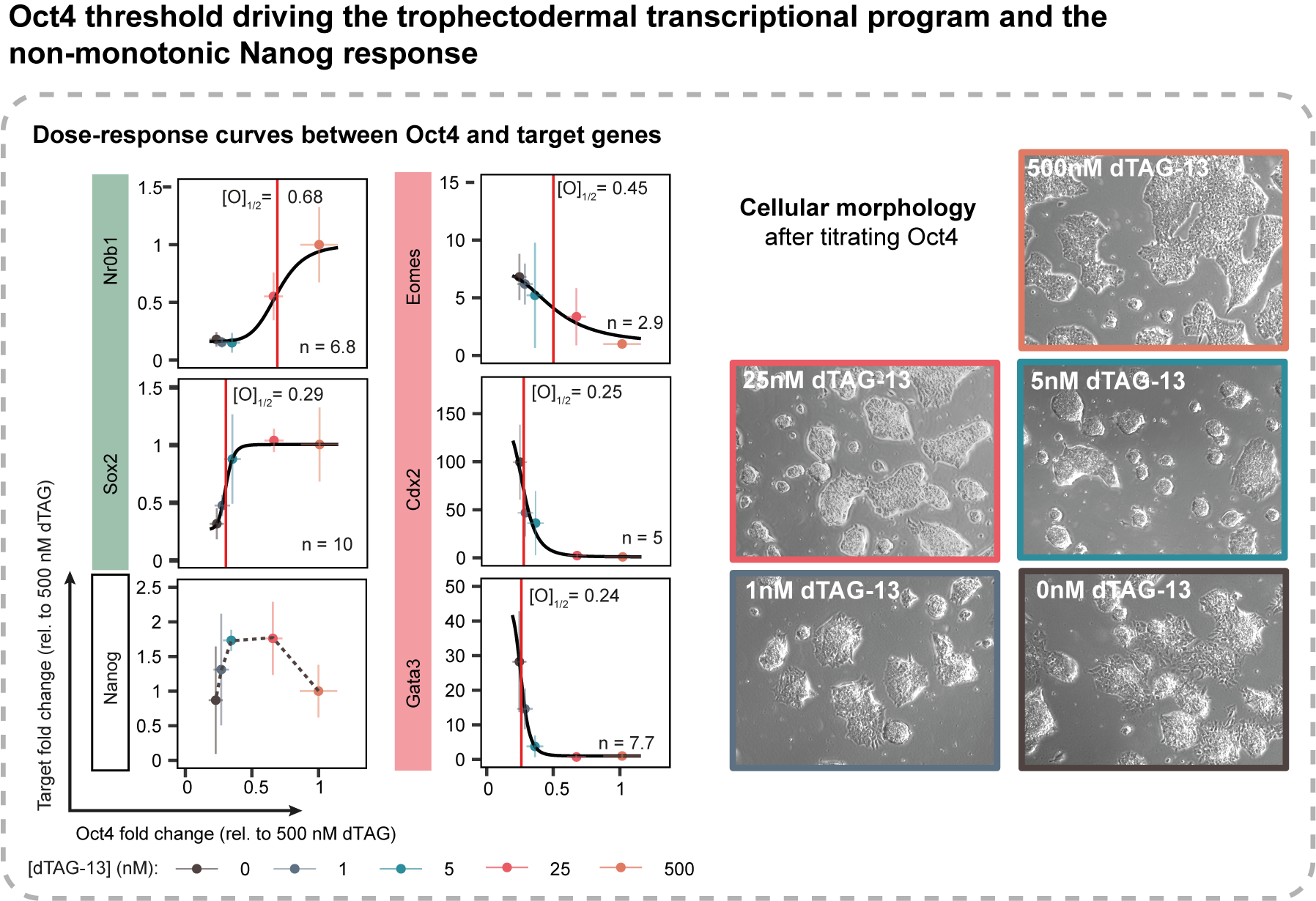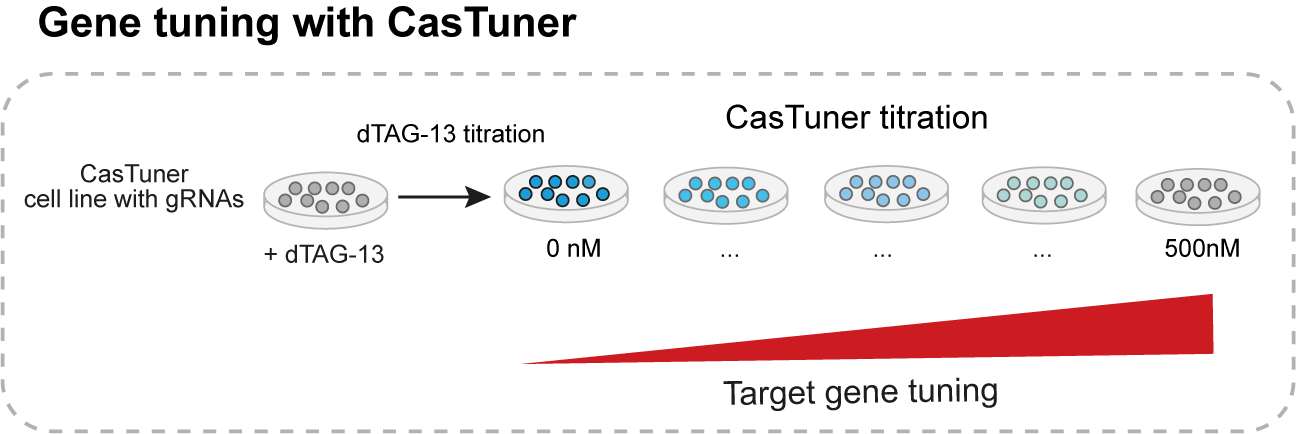 Clearly the main purpose and advantage of CasTuner is that it allows to tune endogenous gene expression. By using sub-saturating concentrations of ligand in the medium, we can obtain intermediate CasTuner levels which in turn repress a target gene only partially. In a typical experiment, we would take cells with the CasTuner system and target guide RNAs stably integrated and seed them in multiple wells, with each well having a different concentration of dTAG-13 within the medium. This way, in each well we can have a different level of target gene expression, ranging from its wild-type level (500nM dTAG-13) to the minimal level achievable (0nM dTAG-13).