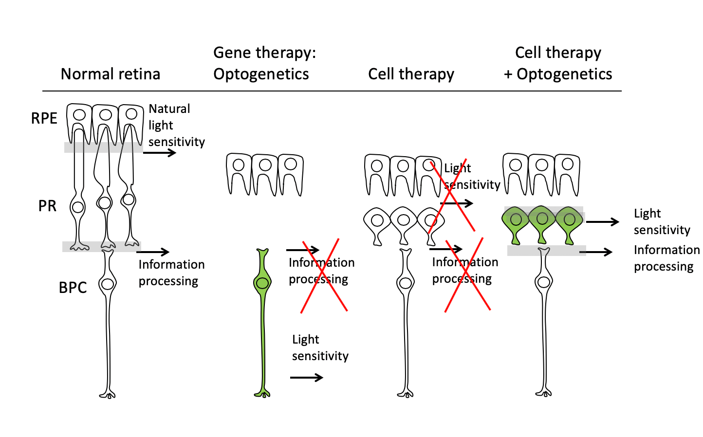 Initially optogenetics has been proposed to restore light sensitivity in patients suffering from photoreceptor cell loss. Optogenetic approaches use viral vectors to deliver opsins to remaining retinal cells (i.e. gene therapy) – they commonly target second and third order neurons downstream from the photoreceptors that are still present in late stages of degenerative diseases. Remaining cones lacking outer segments have also been targeted but less frequently due to concerns about their longevity and the low percentage of patients who still have such structures. This is a bit of a conundrum: conferring light sensitivity to cells downstream from photoreceptors, bypasses the important information processing normally conducted by the inner retinal circuitry. On the other hand, rescuing the function of remaining ‘dormant’ cones can only be useful in a minor portion of late stage RP patients. Cell therapy offers the possibility of replacing the dying photoreceptors with new ones, which would circumvent both shortcomings, but there there’s another hurdle: the difficulty in inducing the grafted cells to grow and maintain light-sensitive outer segments (containing the opsins that capture light)….