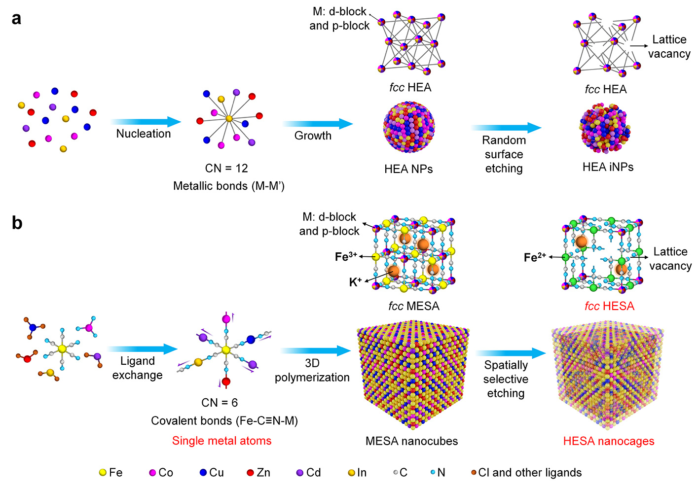 Figure 1. Schematic illustration of the HEA iNPs and HESA NCs generation. a) Colloidal synthesis of HEA iNPs starts with homogeneous nucleation of metal atoms connected by metallic bonds, followed by the growth of nuclei into NPs. After an oxidative etching process, the HEA NPs are supposed to deliver an irregular shape due to the random etching of surface atoms. b) In the case of HESA NCs, the MESA nanocubes are firstly formed via ligand exchange and cyano polymerization, followed by selective etching of the internal space, generating HESA NCs.