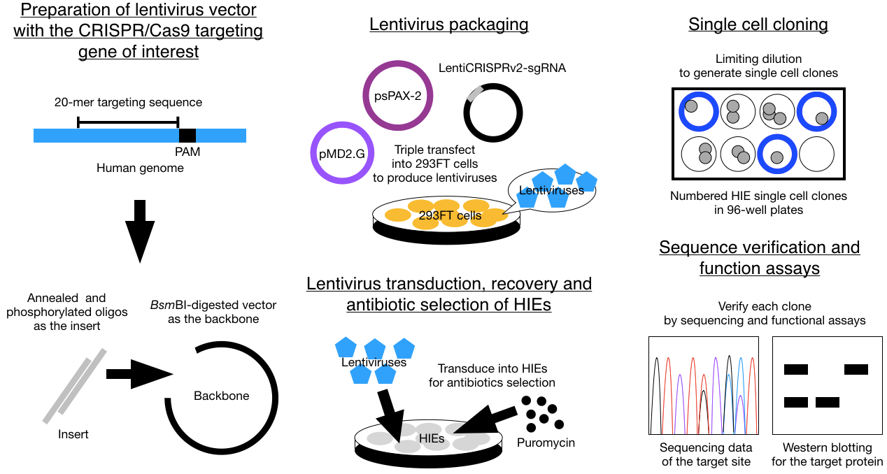 In summary, we are excited to share this simple protocol for making KO HIEs by providing step-by-step instructions for lentiviral transduction and single cell cloning. The technical requirements of knocking out a gene in HIEs are higher than in common cell lines since HIEs are more fragile, slow-growing and sensitive to environmental changes. Hopefully more labs can adapt the Cas9 technique in different organoid cultures easily with the help of this protocol.