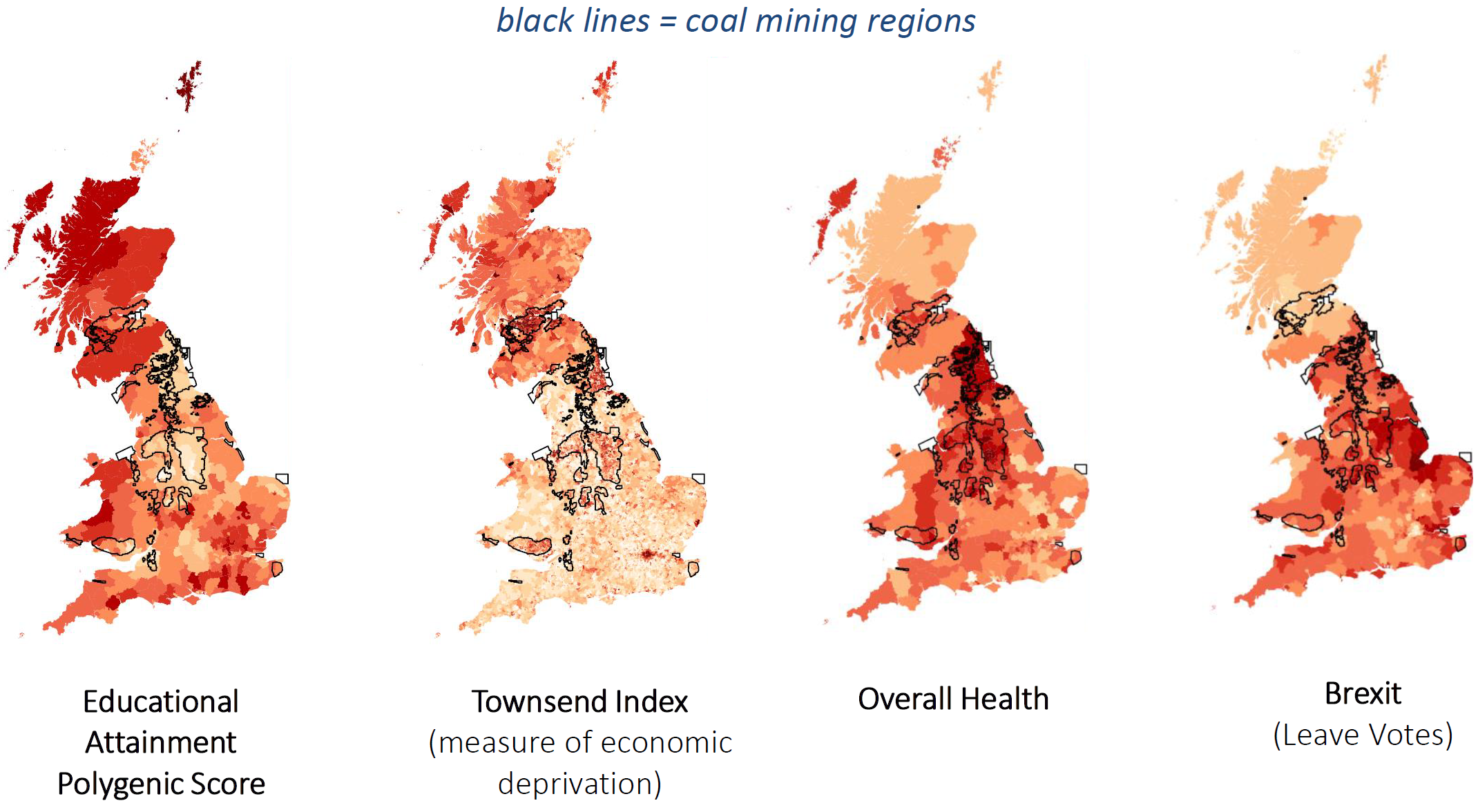 We constructed polygenic scores for more than 30 heritable traits related to physical and mental health as well as normal psychological outcomes such as personality and educational attainment. After carefully controlling for ancestry differences, the polygenic score for educational attainment showed the highest levels of geographic clustering by far. The amount of geographic clustering of all other traits could be predicted by how many genes they shared with educational attainment. Importantly, the clustering of educational attainment alleles was increasig over time because people that left the poorer areas of the country, such as coal mining regions, had higher polygenic scores for educational attainment than the rest of the country on average.