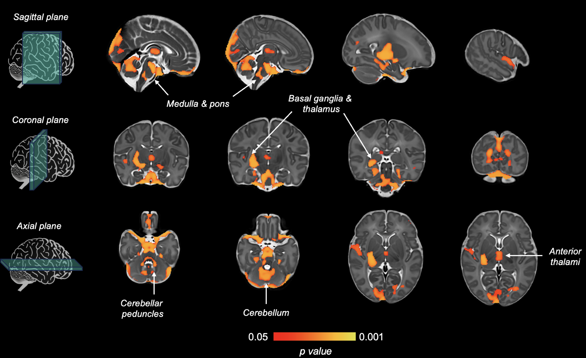 Figure 4. Results showing the brain regions with a statistically significant positive correlation between our new polygenic score for age at onset of walking and tissue volume in a sample of newborn infants’ brains. Many of the significant regions are known to be involved in motor function, such as the cerebellum and basal ganglia.