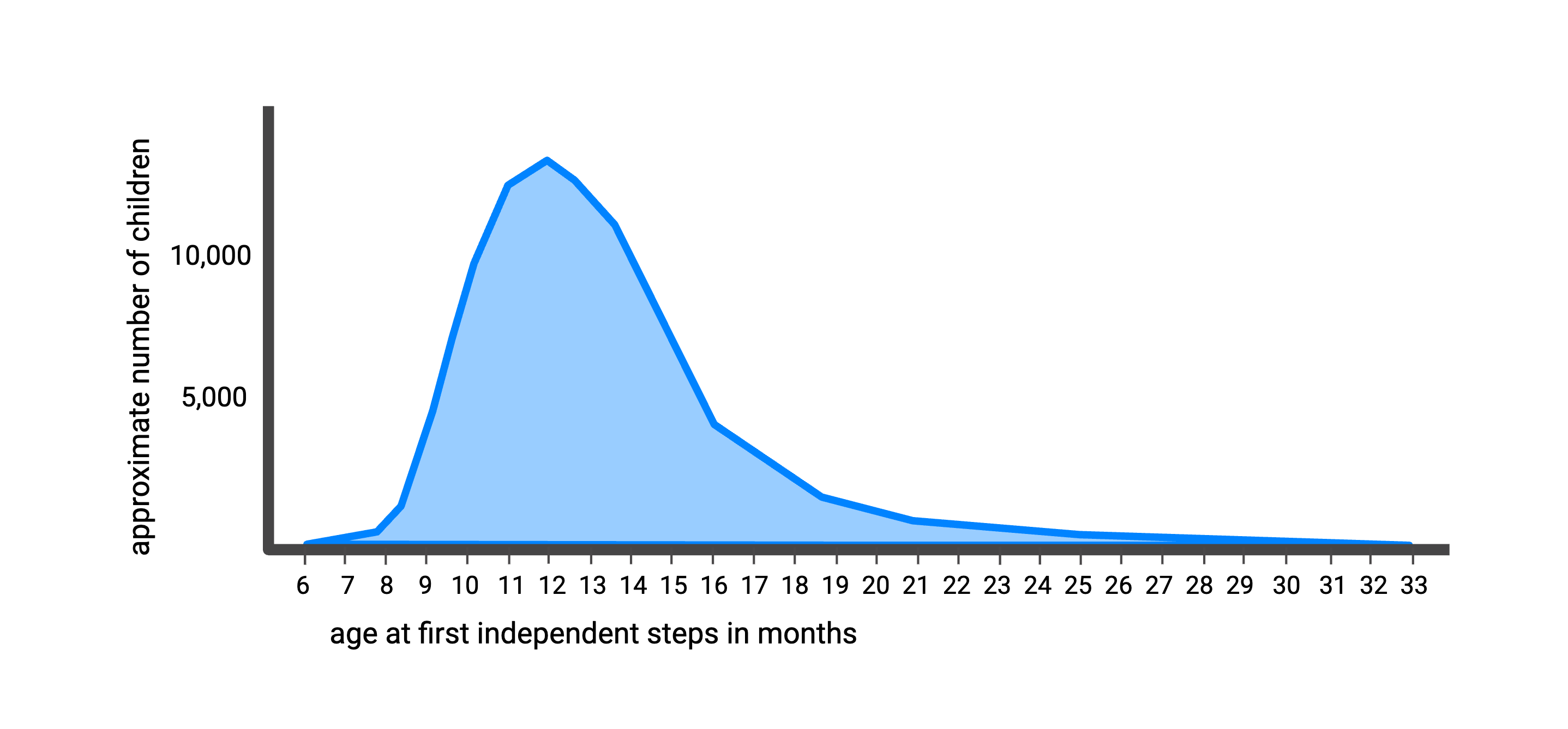 So what influences when a child takes their first step? Babies vary a lot in when this important milestone happens. Most children will begin walking sometime between 8 and 18 months (WHO, 2006). However, as shown in Figure 2 below, there are wide differences among children in when they first take a step on their own. Not much is known about what causes these wide differences in age at onset of walking.