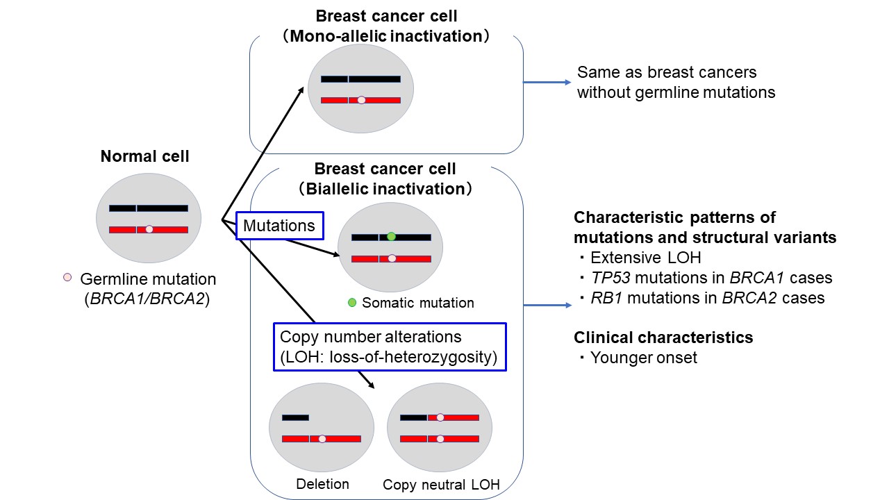 To summarize, we revealed that breast tumors with pathogenic germline BRCA1/2 variants show different genetic and clinical characteristics depending on the presence or absence of biallelic inactivation of these genes. Our data also highlights the importance of allelic status of cancer driver genes and the heterogeneity of breast cancers with germline variants. Further studies will be required to reveal the genomic landscape of breast tumors with germline variants in other breast cancer susceptibility genes.